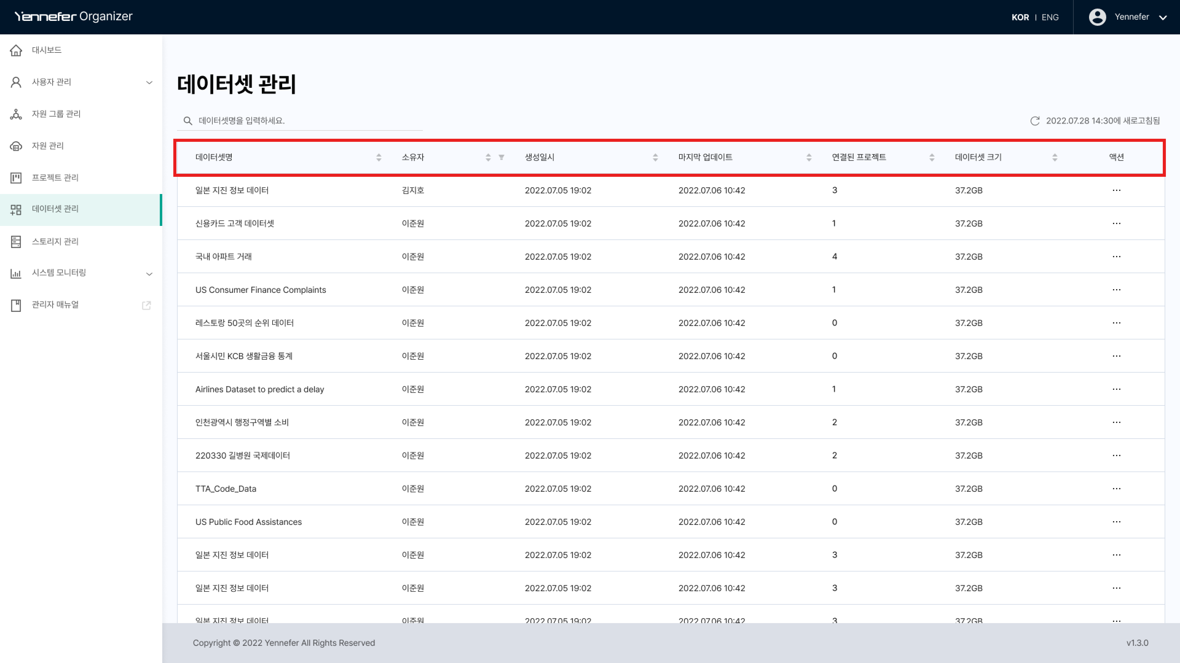 * 데이터셋 관리 페이지는 **데이터셋 검색 및 데이터셋 목록**으로 구성되어있습니다.