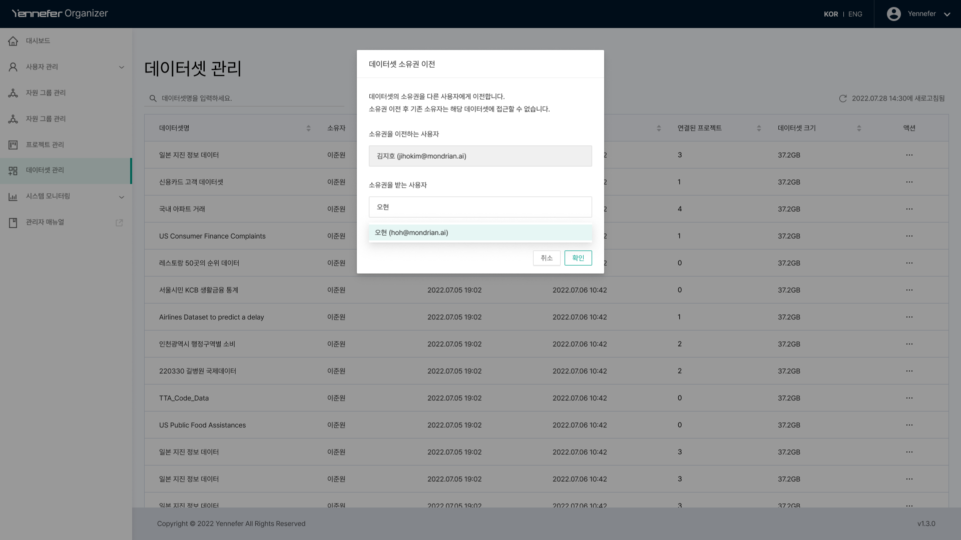 * 출력된 모달에서 소유권을 받는 사용자의 이름이나 이메일을 입력하고 확인 버튼을 클릭합니다.
