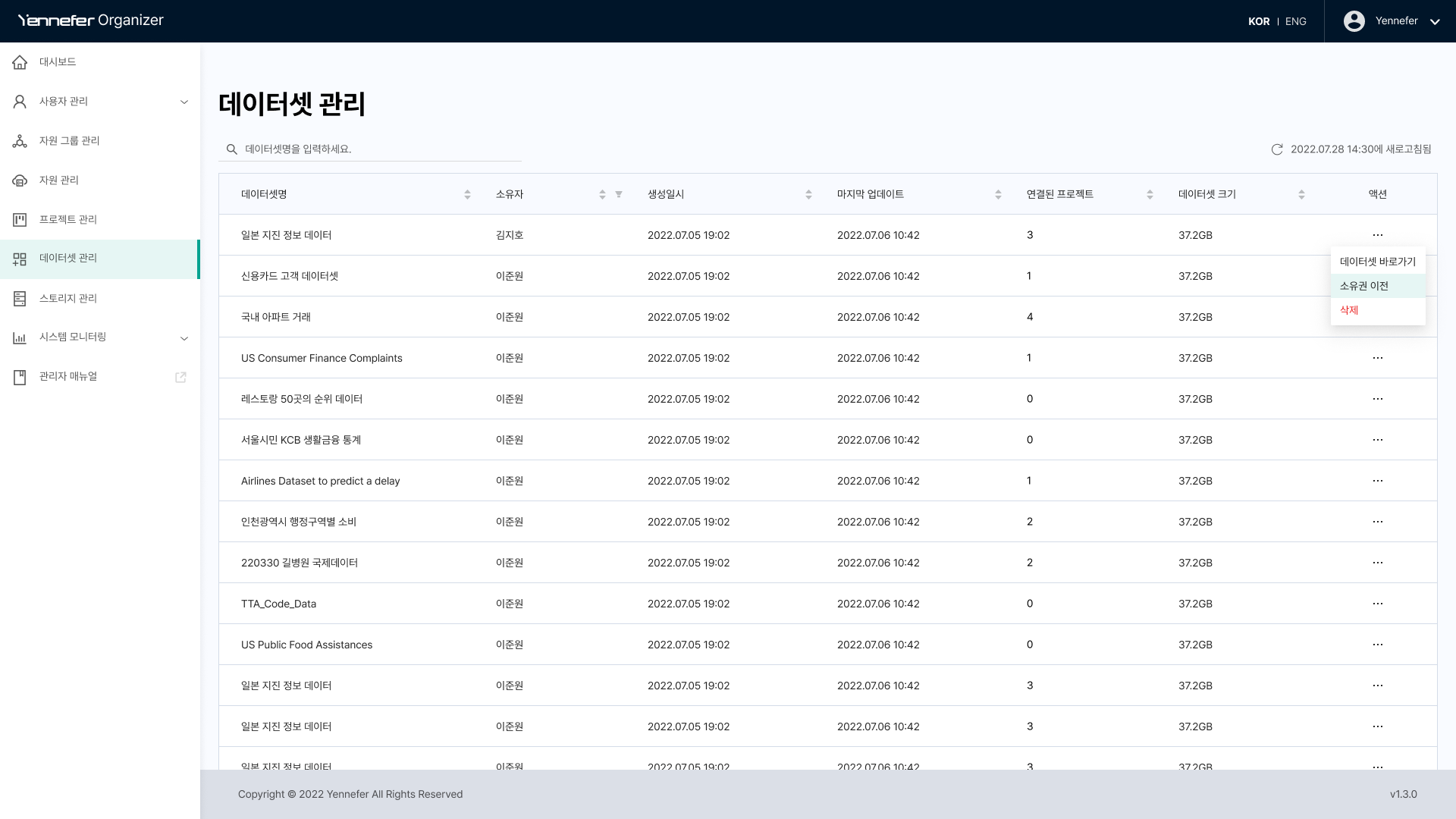 * 관리자는 데이터셋의 소유자를 다른 소유자로 변경할 수 있습니다. 데이터셋 관리 페이지에서 소유권을 변경하고자 하는 데이터셋의 액션 - 소유권 이전을 선택합니다.