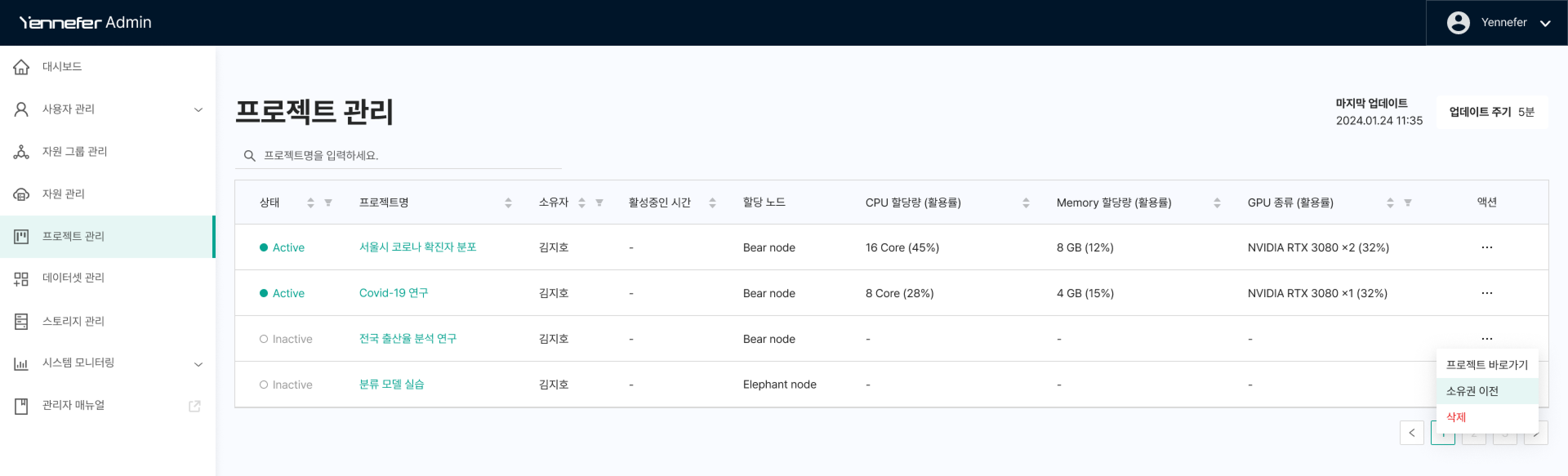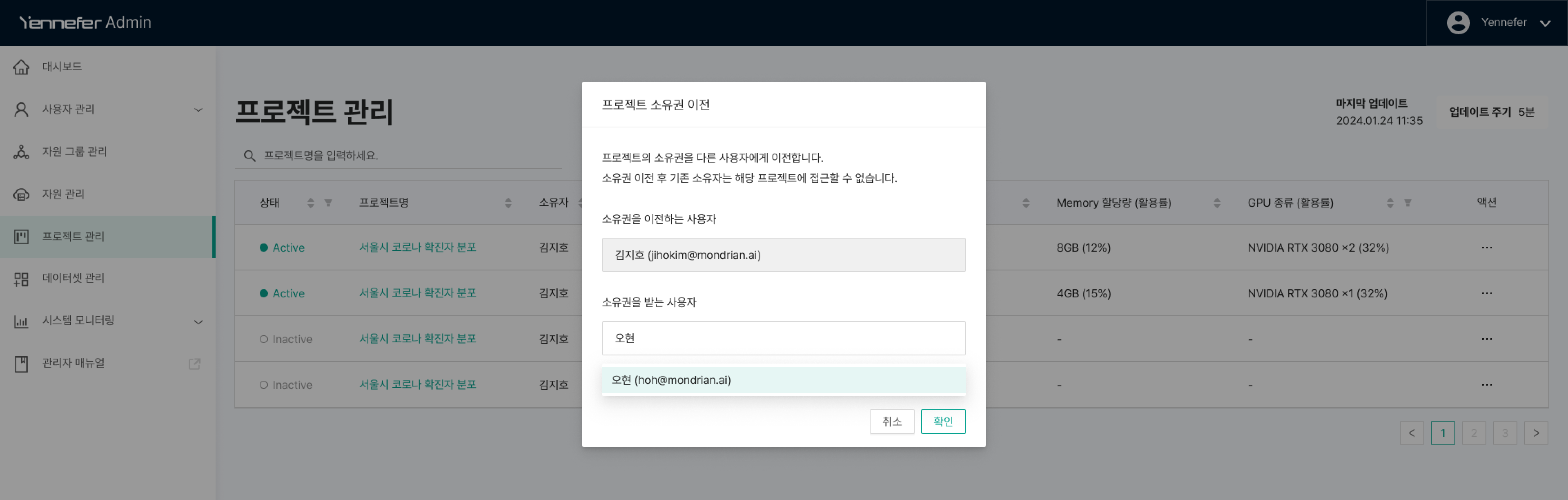 * 관리자는 프로젝트의 소유자를 다른 소유자로 변경할 수 있습니다. 프로젝트 관리페이지에서 소유권을 변경하고자 하는 프로젝트에 액션 - 소유권 이전을 선택합니다.