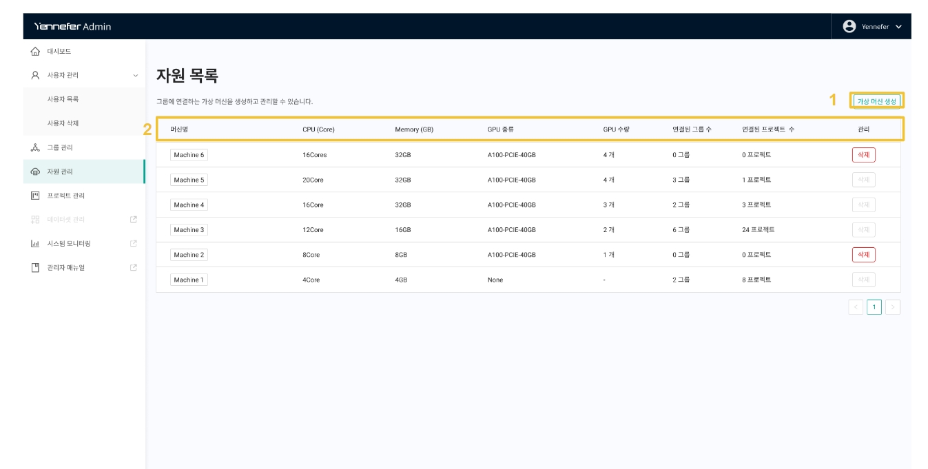 - 관리 : 관리에서는 그룹을 삭제할 수 있습니다. 단, 해당 머신(자원)과 연결된 그룹과 프로젝트가 없는 경우에만 삭제 가능합니다. 연결된 그룹과 연결된 프로젝트 수가 존재하면 머신 수정이 불가합니다.