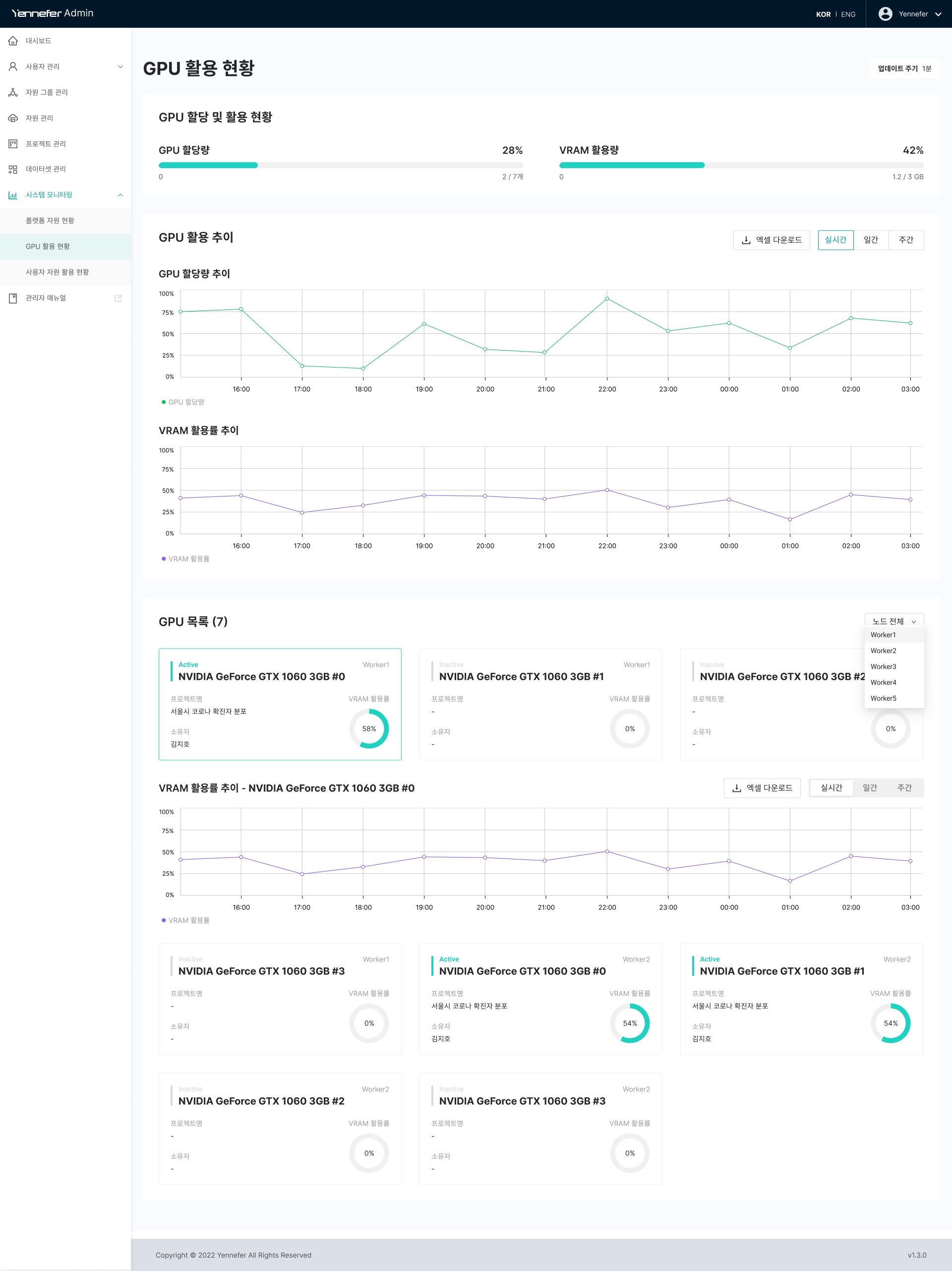 플랫폼에서 사용중인 GPU의 할당량과 VRAM 활용률을 조회할 수 있고 GPU 자원의 활용 추이를 조회할 수 있습니다.