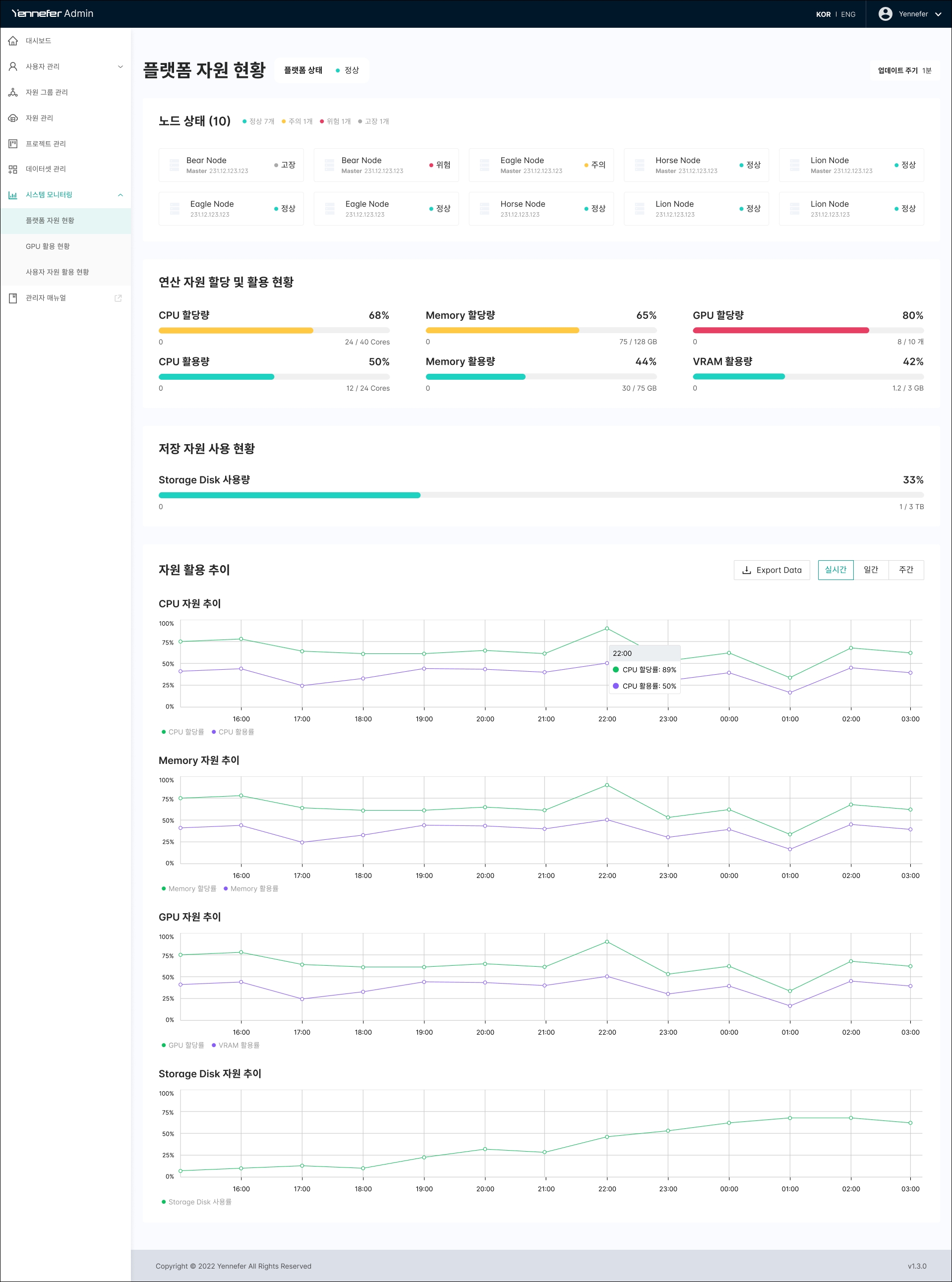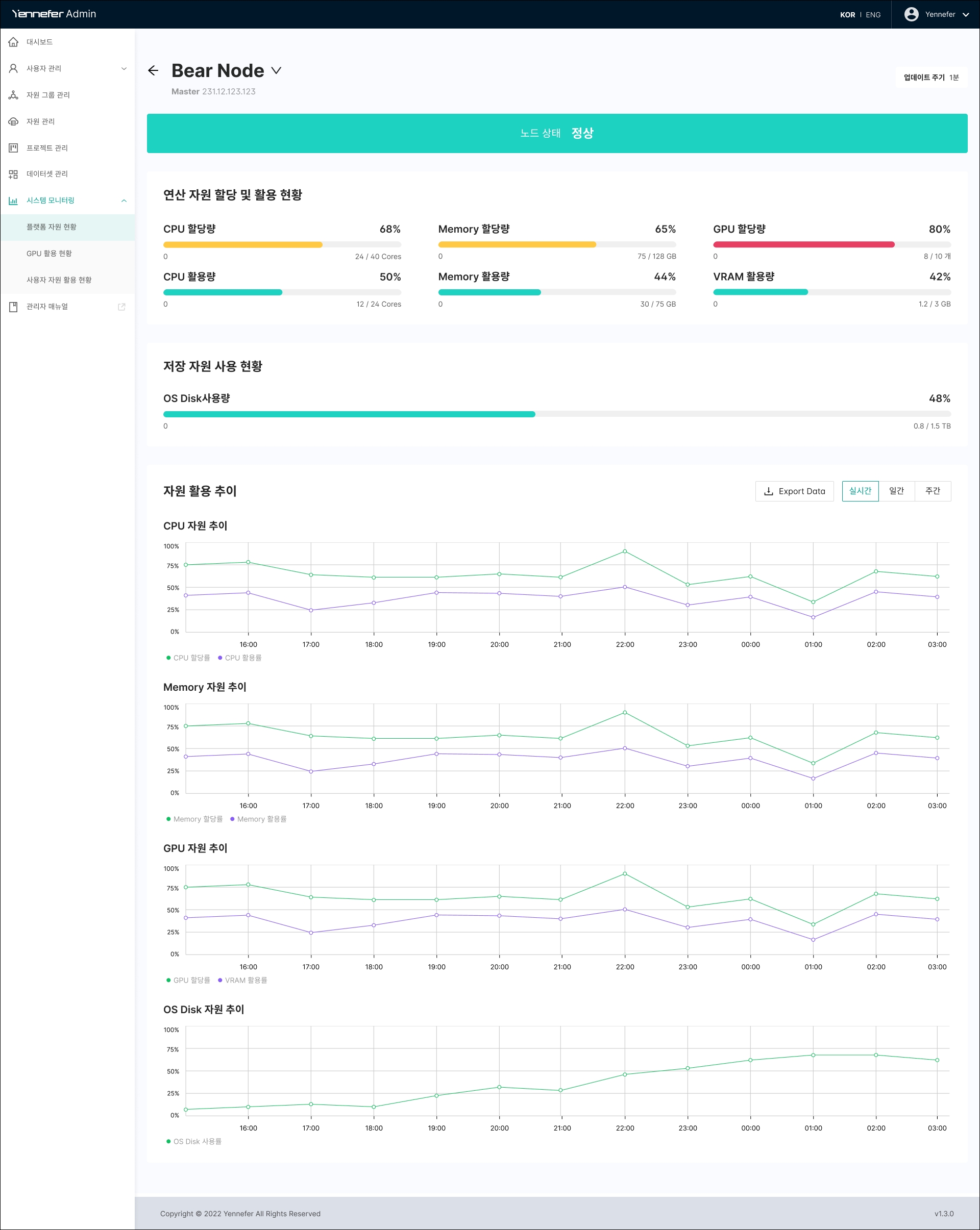 플랫폼에 설치되어 있는 노드의 상세페이지로 각 노드별 자원 활용 현황을 조회할 수 있습니다.