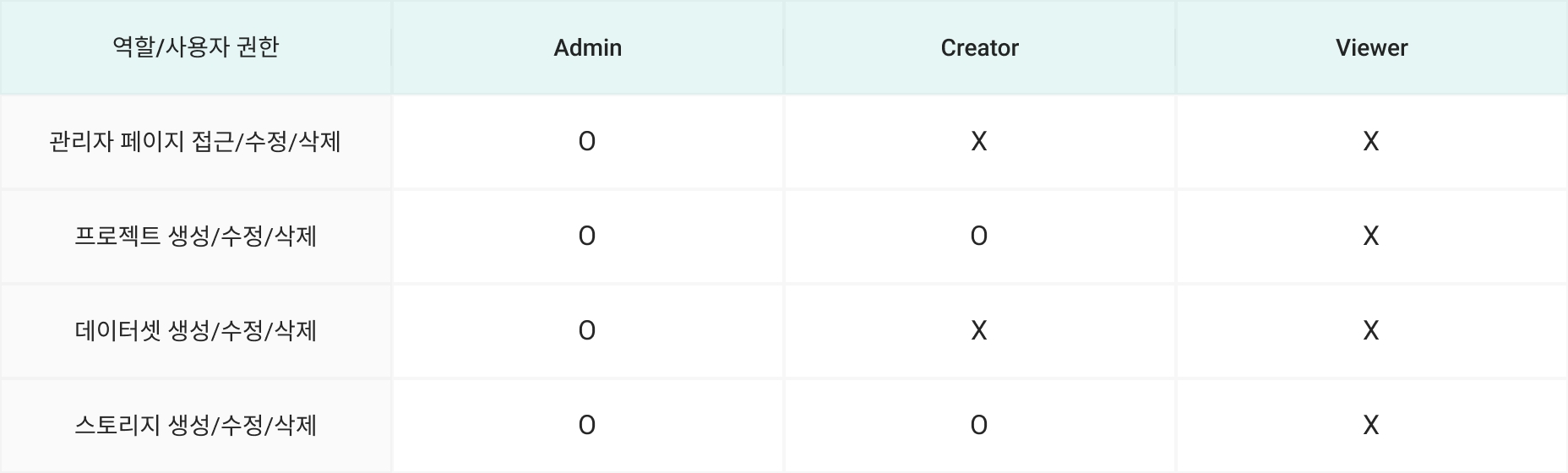 사용자 권한별 허용되는 기능은 다음과 같습니다. Viewer의 경우, Studio 및 Dataset에 대하여 조회만 가능합니다.