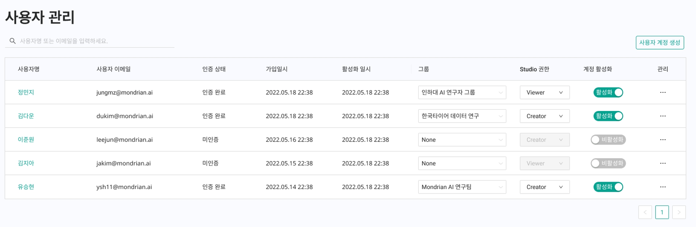 사용자 관리는 사용자 목록과 사용자 삭제로 구성되어있습니다. 사용자의 정보 조회 및 사용자별 권한 관리가 가능하며, 계정을 추가 및 활성화하거나 상태를 변경할 수 있습니다.