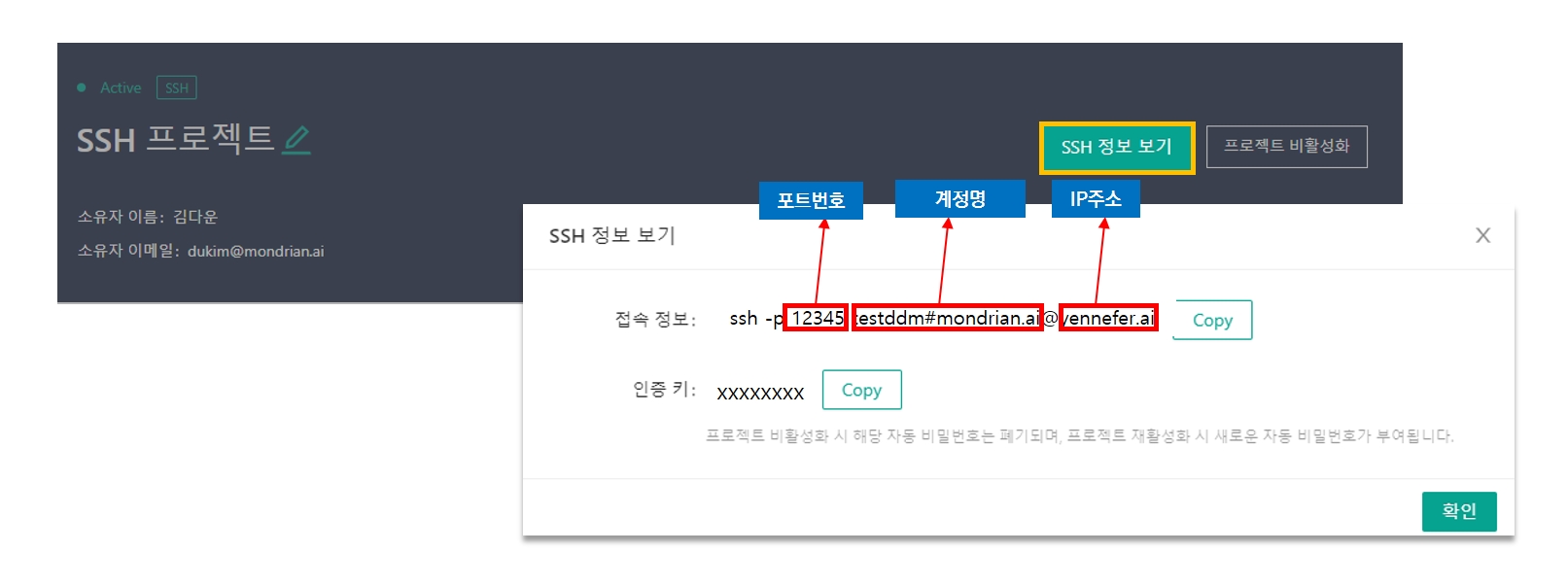 “SSH 정보 보기” 버튼을 클릭하면, 접속 정보 및 인증 키를 제공 받으실 수 있습니다. 이렇게 제공 받은 정보는 VScode에서 원격 접속 시 활용되니 참고하시기 바랍니다.