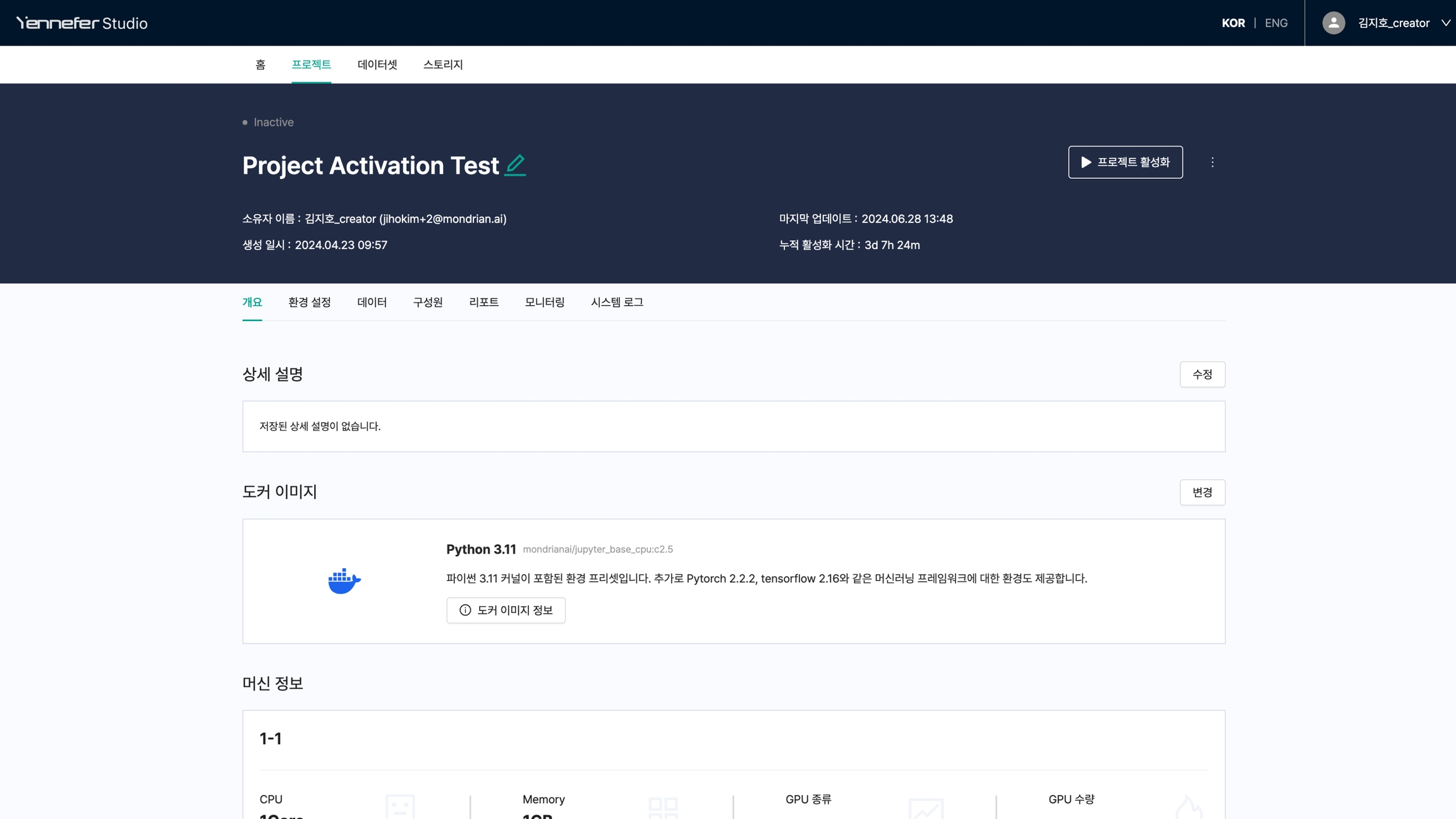 개요 : 프로젝트에 대한 상세설명, 도커 이미지, 머신 정보, 최근 추가된 데이터셋을 확인할 수 있습니다.