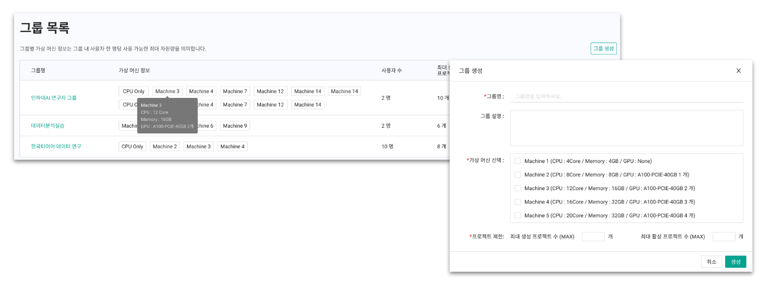 * 프로젝트 개수를 제한하여 관리자는 그룹별로 효율적인 자원 운영이 가능니다.