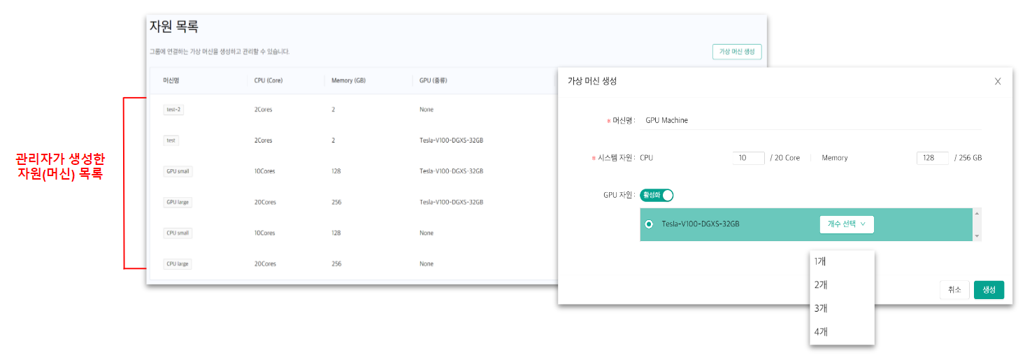* CPU, 메모리, GPU, 연산 자원을 관리자가 지정 가능하며 특정 머신과 연결된 그룹의 수를 확인할 수 있습니다.
