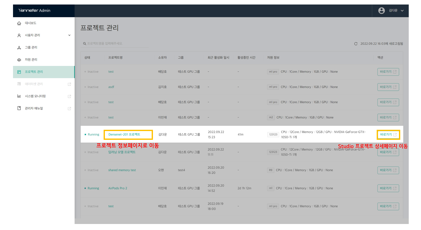 * Admin의 프로젝트 관리 기능을 통해 관리자는 **생성된 모든 프로젝트 현황을 확인하고 관리**할 수 있습니다. &#x20;
