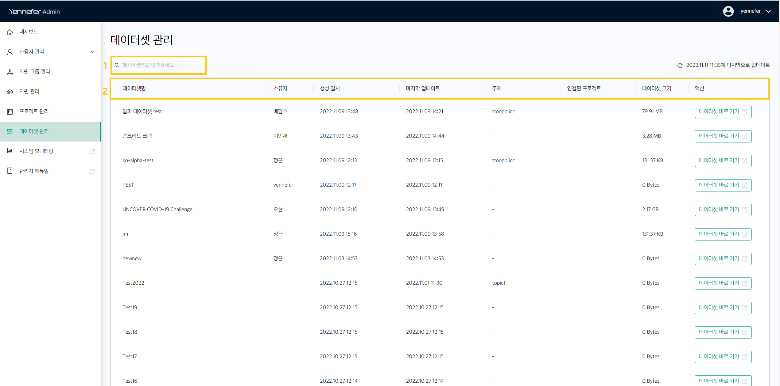 * 데이터셋 관리 페이지는 데이터셋 검색 및 데이터셋 목록으로 구성되어있습니다.