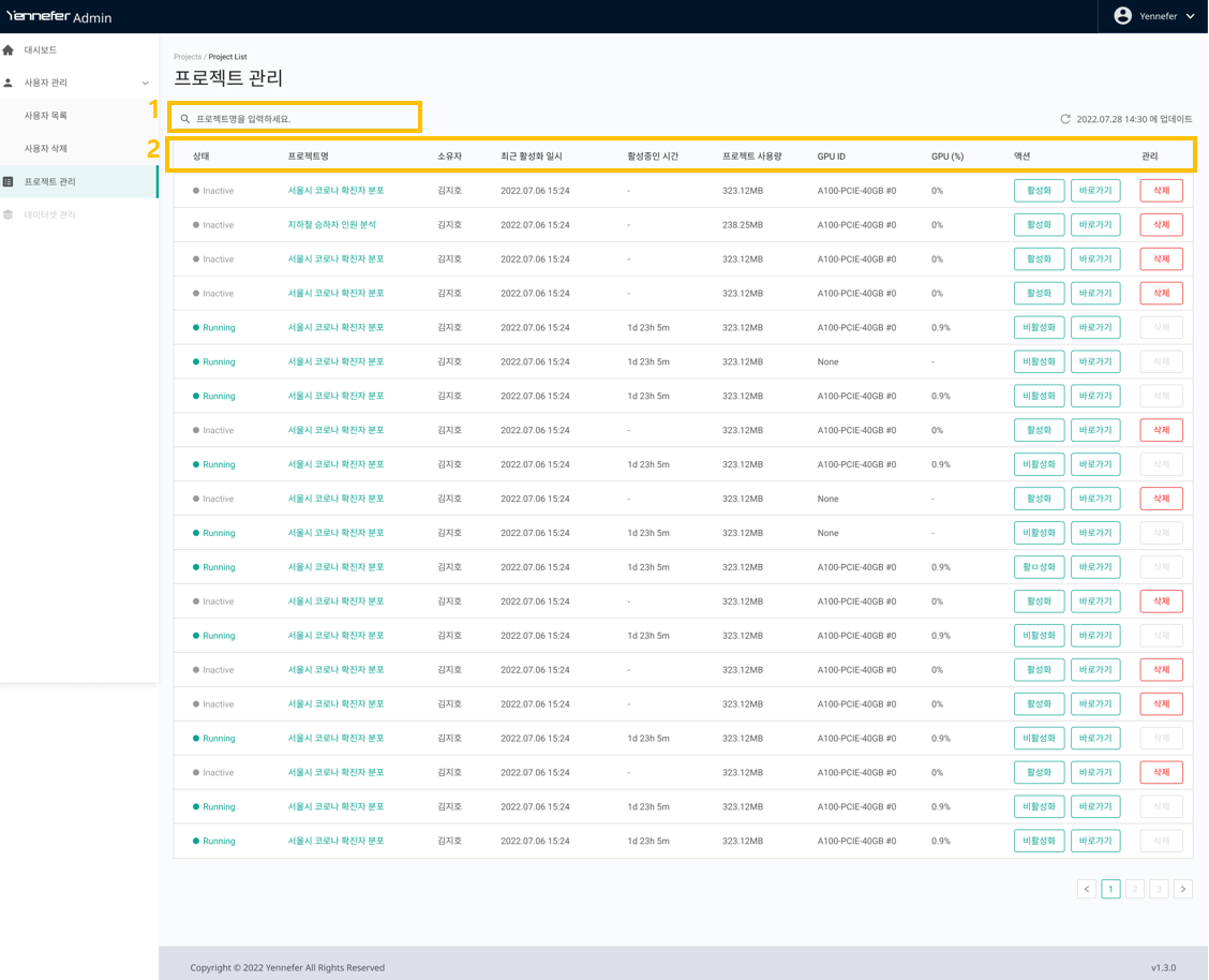 프로젝트 관리에서 시스템에 생성된 전체 프로젝트 현황을 확인하고 제어할 수 있습니다.