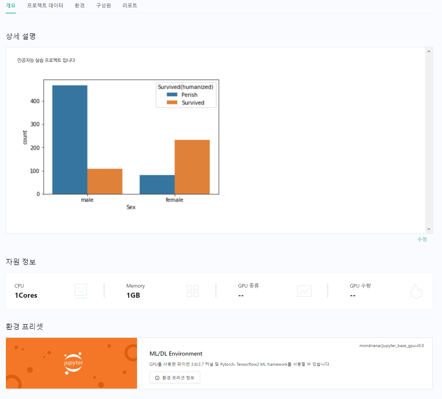 * **개요** : 프로젝트에 대한 상세설명, 자원 정보, 환경 프리셋을 확인할 수 있습니다.