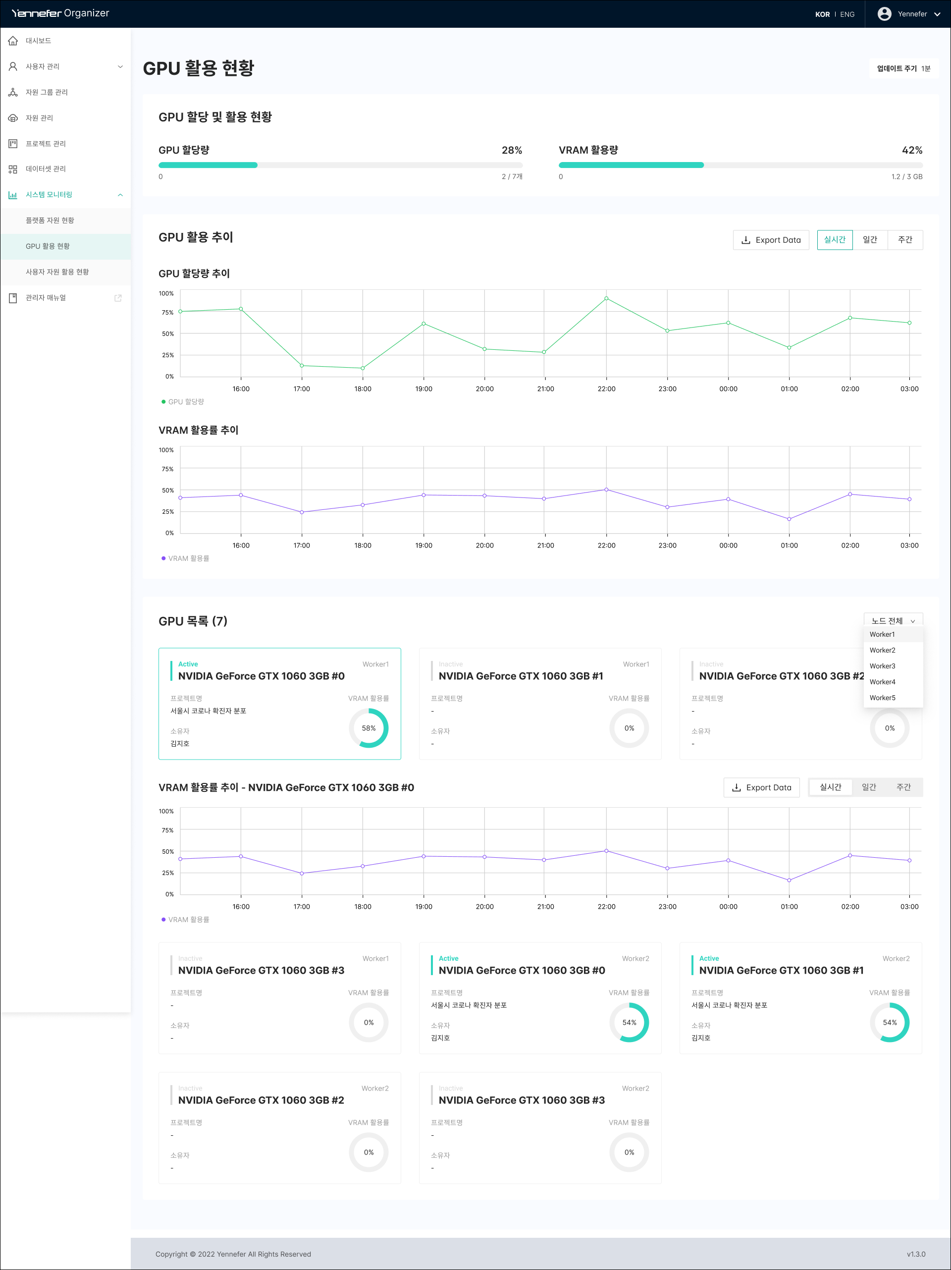 * GPU 할당 및 활용 현황 : 플랫폼의 전체 GPU중 현재 할당된 GPU의 개수를 확인하고 할당된 GPU들의 현재 활용량을 조회할 수 있습니다.