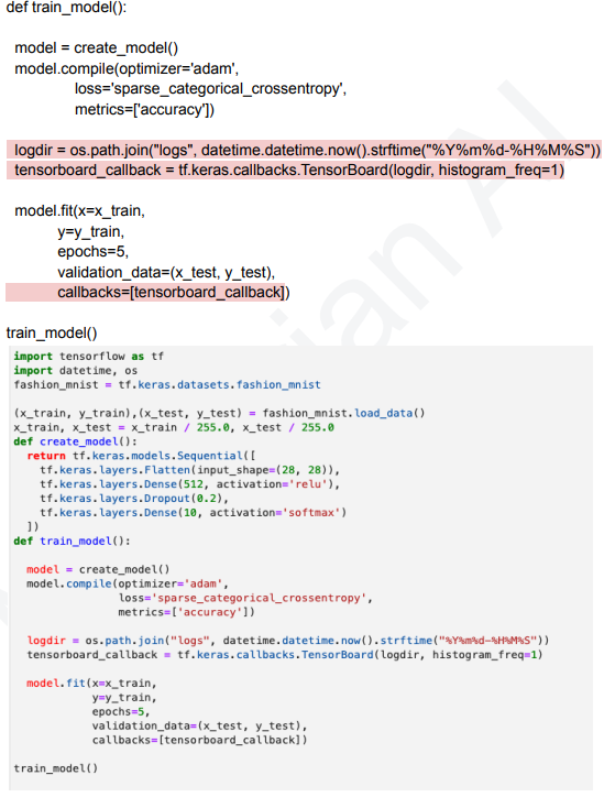 8. 학습 시 logdir와 tensorboard_callback변수를 추가하여야 합니다. (참고 코드 : https://www.tensorflow.org/tensorboard/tensorboard_in_noteb ooks)