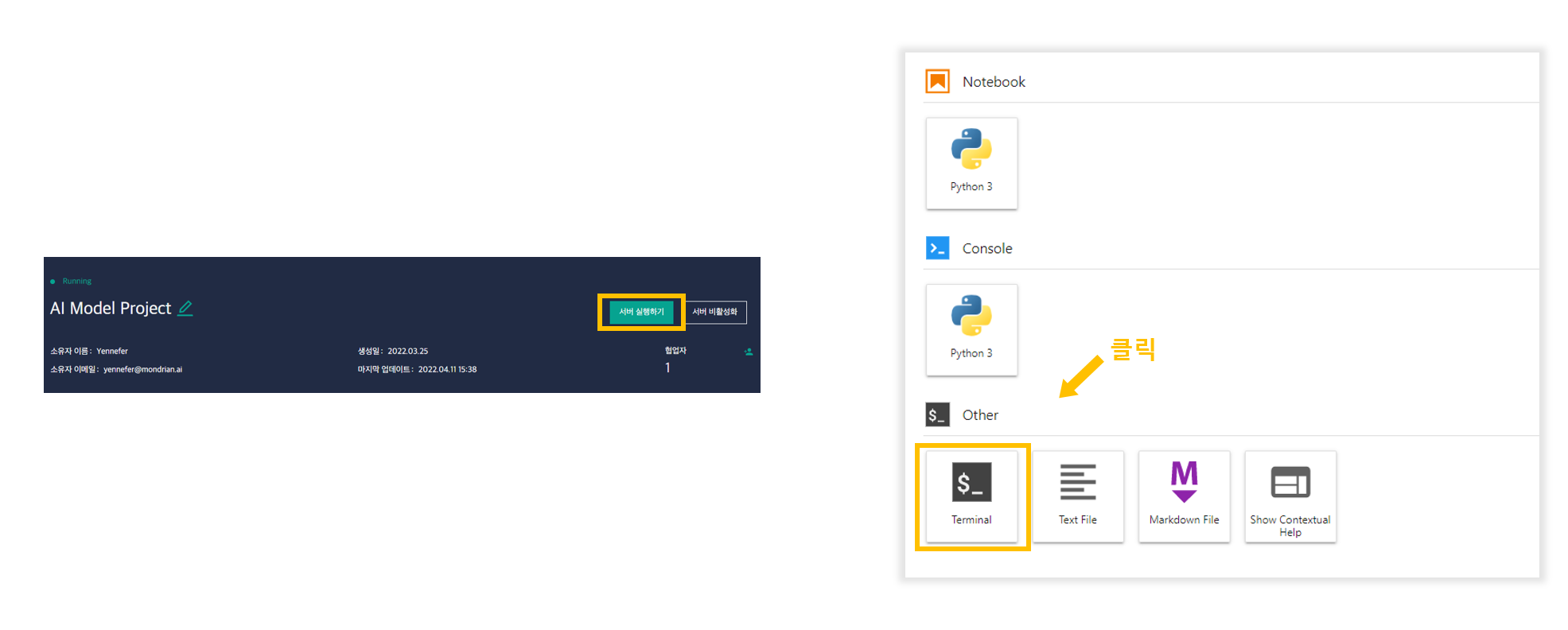 Yennefer Studio 프로젝트 상세페이지에서 "서버 활성화 > 서버실행하기"를 클릭하여 IDE를 실행합니다.