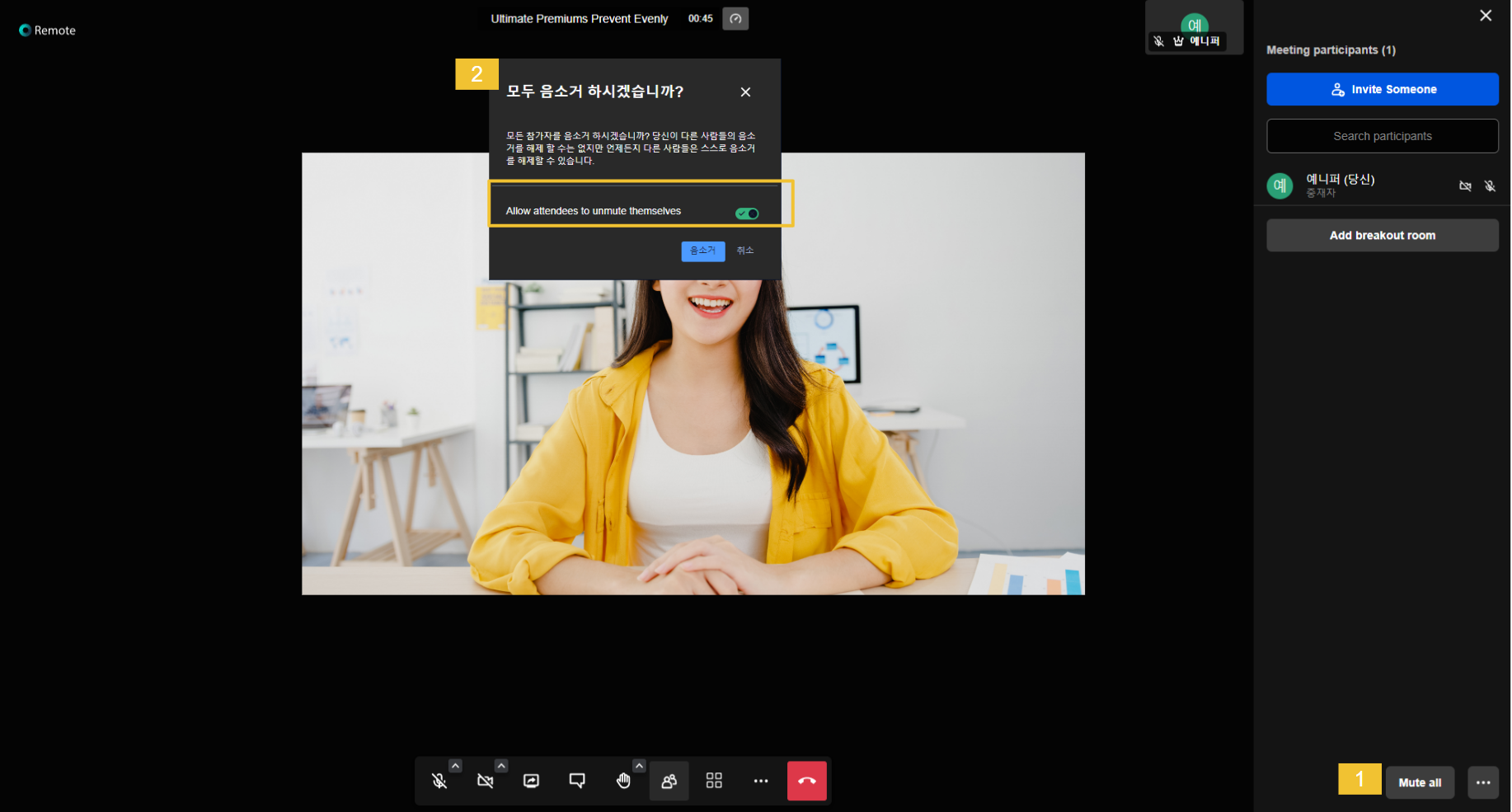 * 단,  **Allow attendants to unable themselves**를 설정하지 않으면 참가자가 중재자(방장)에게 음소거 해제 요청을 해야만 음소거가 해제됩니다.&#x20;