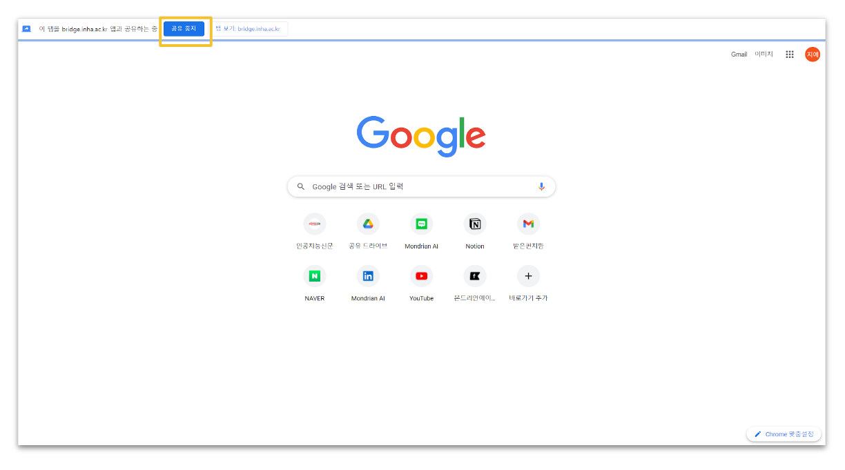 * 화면 공유를 중지하려면 상단의 **공유 중지**를 클릭합니다.&#x20;