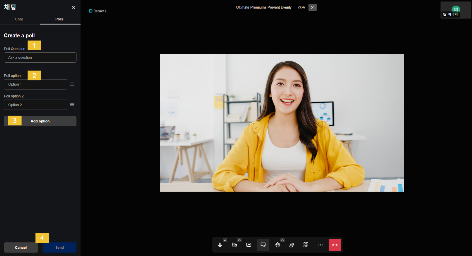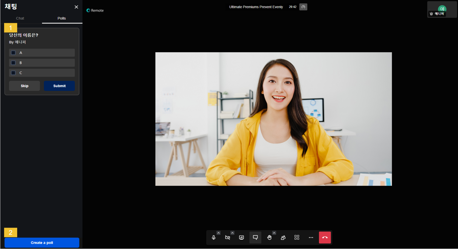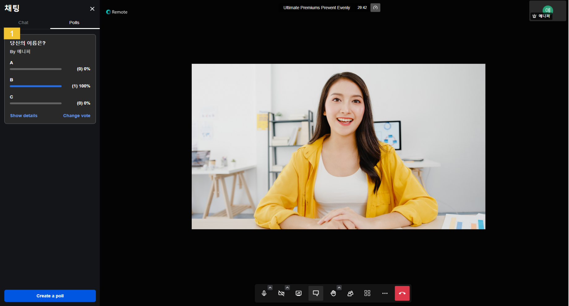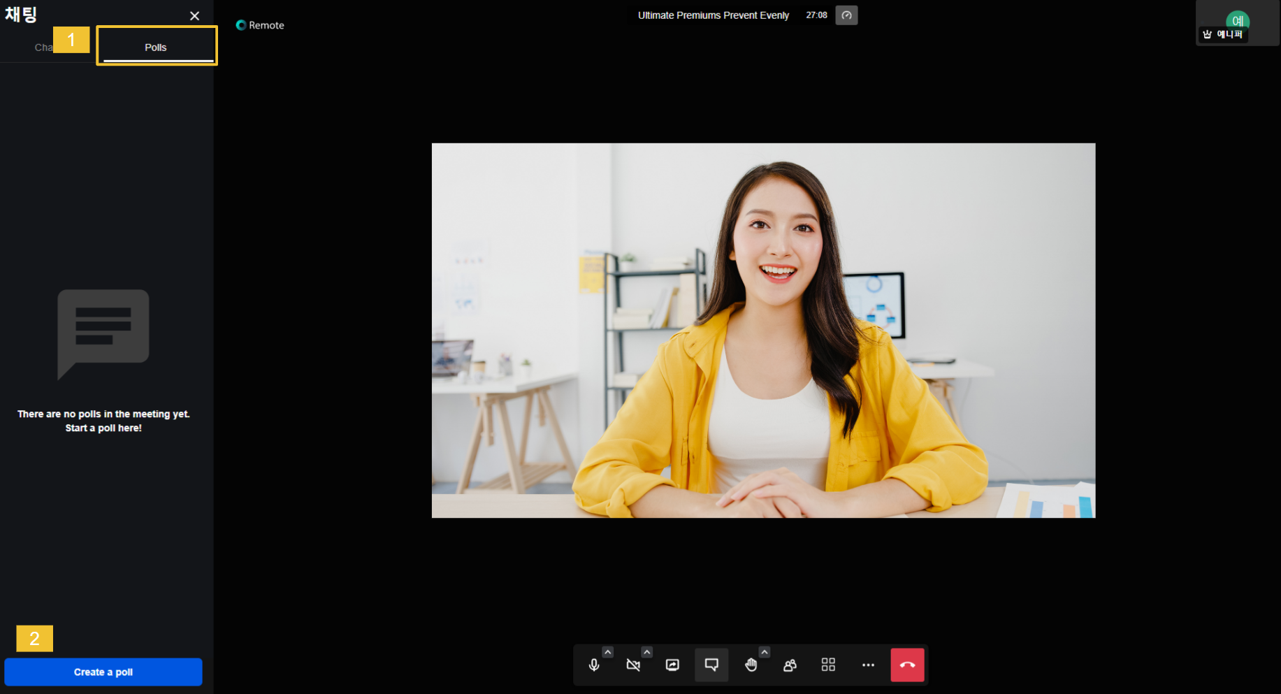 * 추가로, 채팅 창에서 설문지를 생성할 수 있습니다. Polls를 클릭한 후 하단에 **Create a poll**을 클릭합니다.  <br>