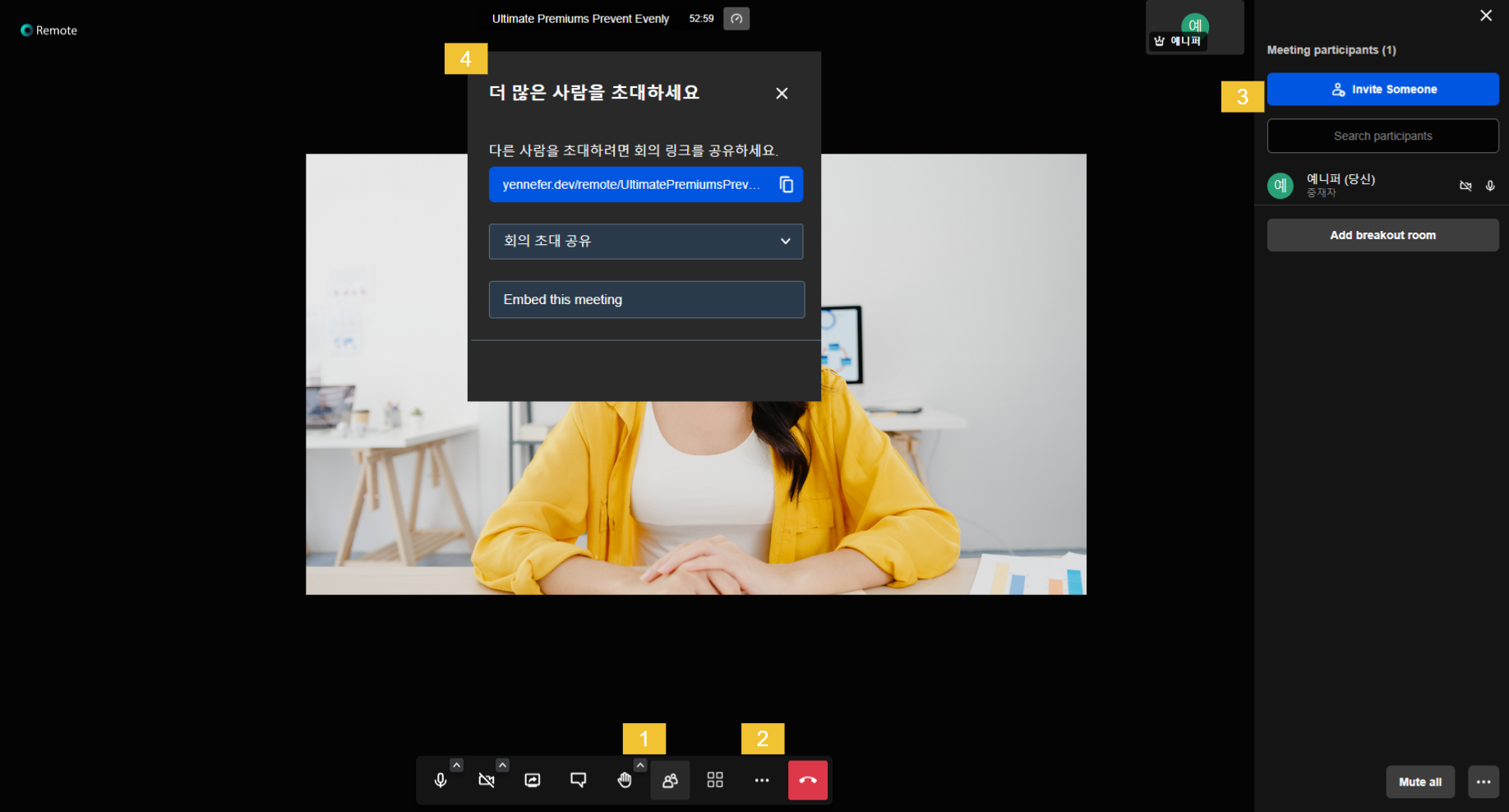 * 두번째는 하단의 사람 아이콘을 클릭하고 **Invite Someone**을 클릭하여 회의링크를 공유하거나, 회의 초대 내용을 직접 메일로 공유하거나 미팅을 임베드 합니다.&#x20;