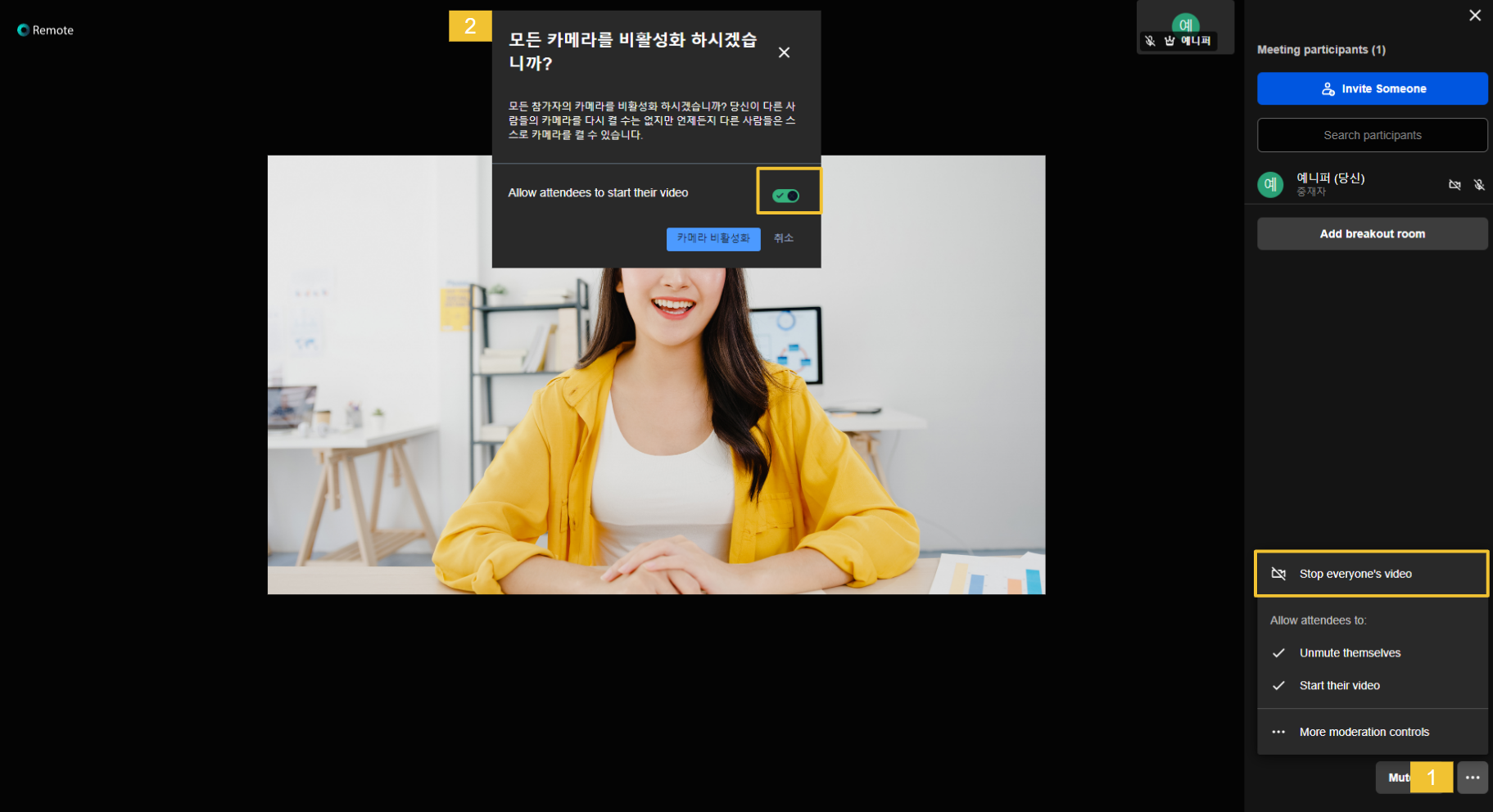 * **Allow attendants to unable start their video**를 설정하지 않으면 참가자가 중재자(방장)에게 음소거 해제 요청을 해야만 카메라가 활성화됩니다.&#x20;