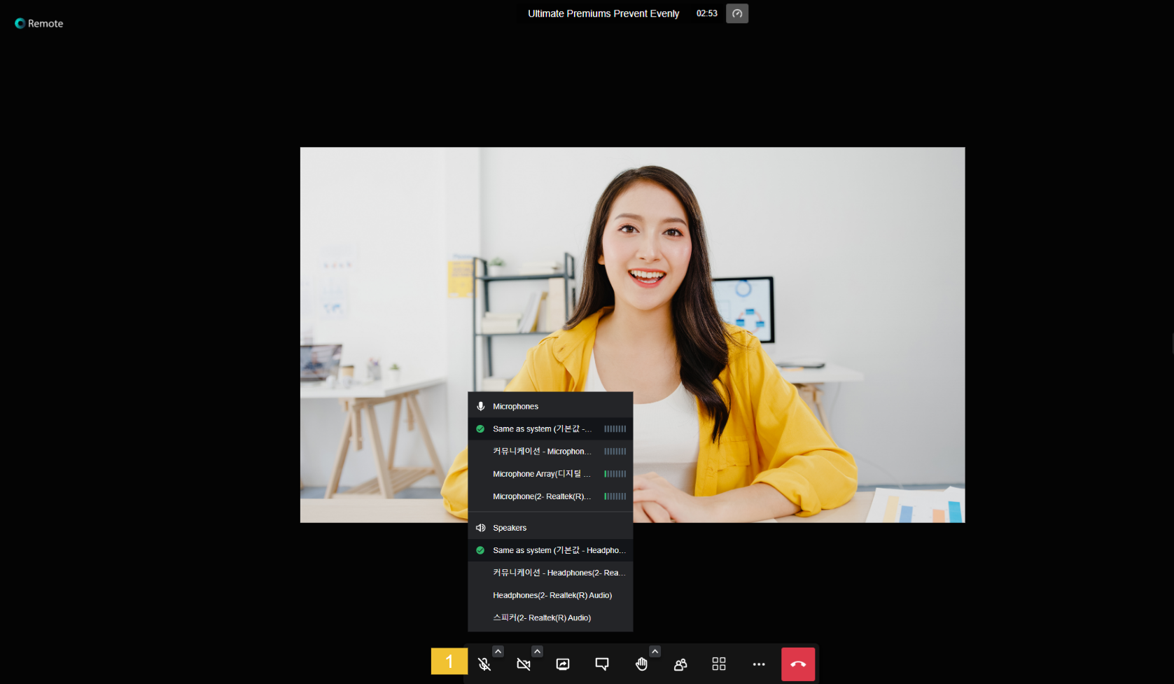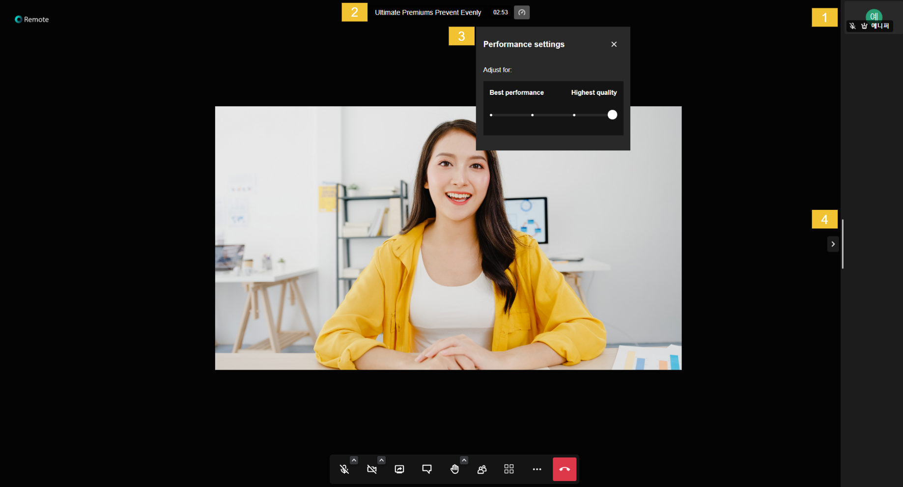 * **Performance setting** : 회의 시간 옆 시계 모양을 클릭하면 Performance settings가 가능하며 Best performance는 오디오 전용이며 Highest quality는 화면의 품질 등급을 의미합니다.&#x20;