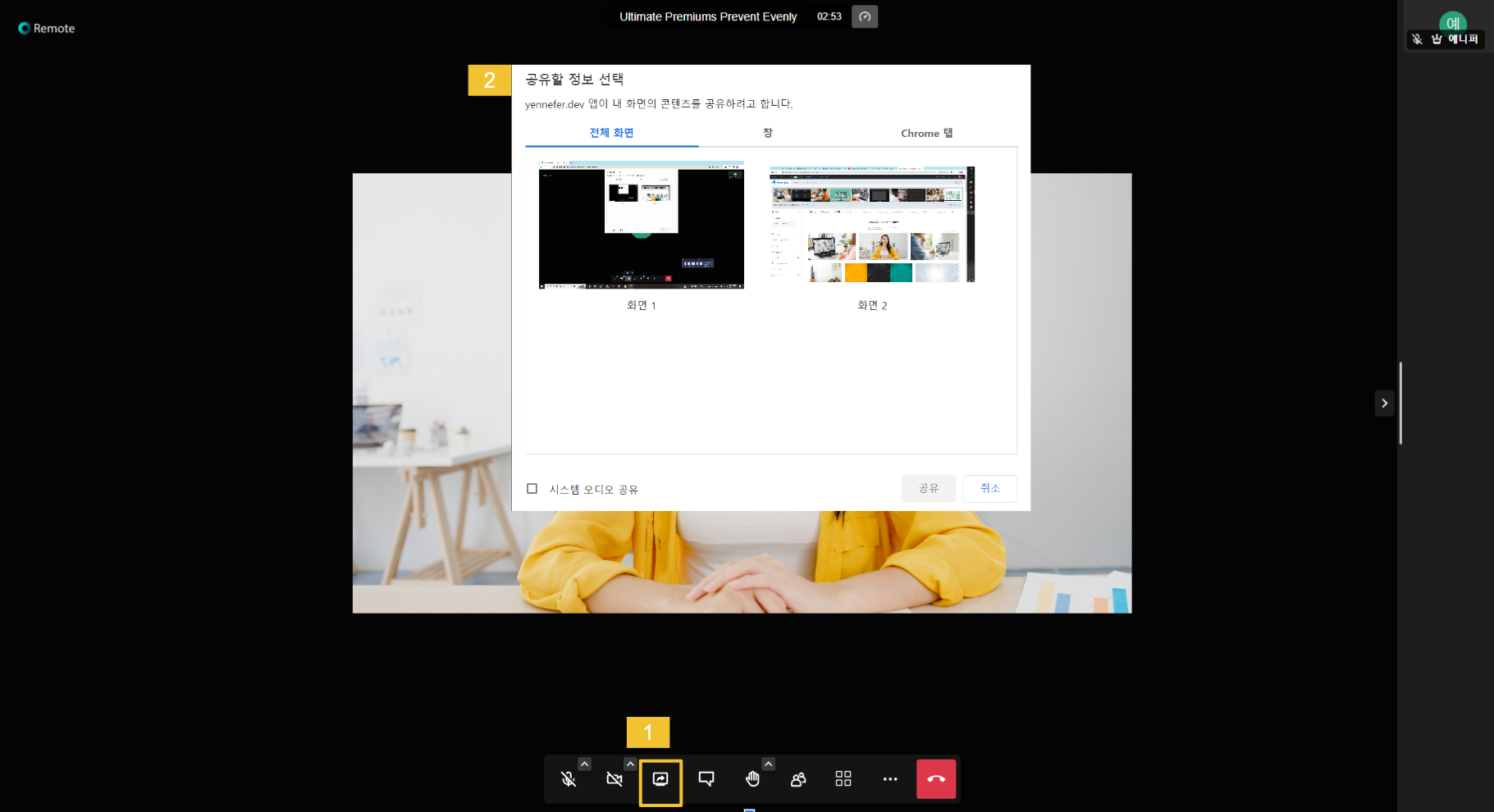 * 하단에 표시되어 있는 모니터 모양을 클릭하면 공유할 정보 선택의 팝업  창이 뜹니다.&#x20;