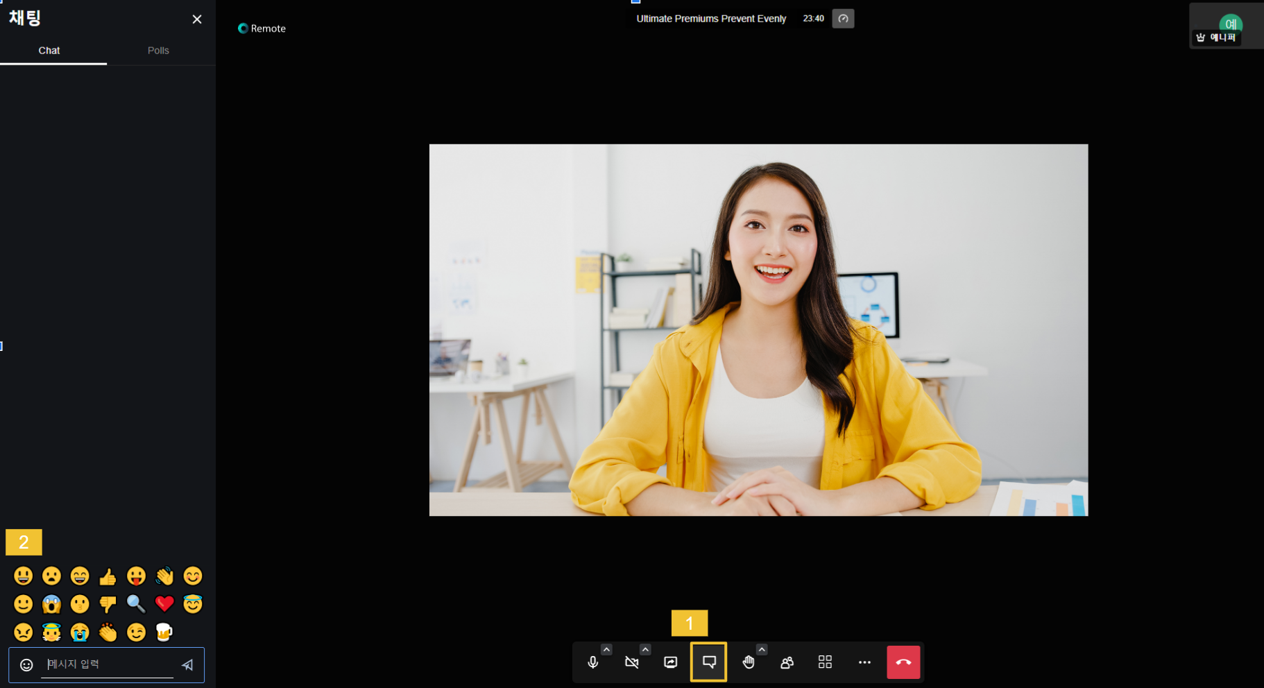 * 하단의 **손 모양 아이콘**을 클릭하면 해당 사용자의 화면에 손 모양 표시가 나타나고 손을 다시 클릭하면 손 모양 표시가 없어집니다. ^를 클릭하면 이모티콘 사용이 가능하며 올라갔다가 사라지는 애니메이션과 함께 사운드 효과도 나타납니다.&#x20;