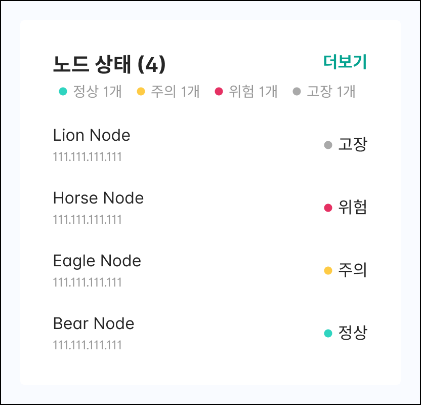 * 노드의 상태는 정상 / 주의 / 위험 / 고장으로 구분됩니다. 노드 상태의 구분 기준은 각 노드의 OS Disk 사용량을 기준으로 60% 이상은 주의, 80% 이상은 위험으로 구분됩니다. 그 외의 에러 등의 경우 고장으로 표기됩니다.
