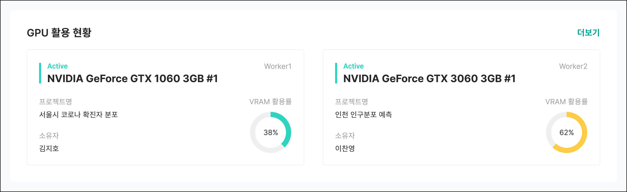 * 해당 GPU가 속한 노드 번호와 활용중인 프로젝트명, 프로젝트 소유자, VRAM 활용률을 조회할 수 있습니다.