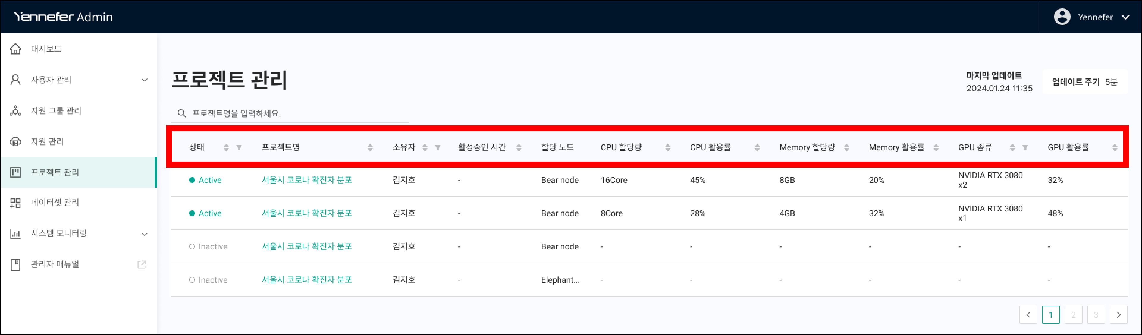> 프로젝트 관리에서는 시스템에 생성된 전체 프로젝트 현황을 확인하고 제어할 수 있습니다.