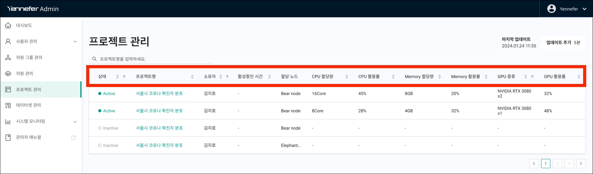 Yennefer Admin의 프로젝트 관리 화면입니다.