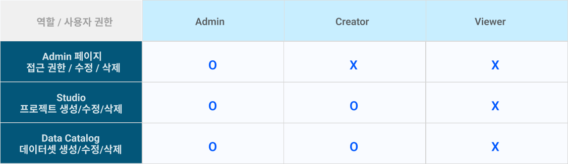 * **Studio 권한 :** 사용자가 부여 받은 Studio그룹으로. 권한에 따라  Studio의 프로젝트와  Data Catalog의 데이터셋에 접근이 가능합니다. ([사용자 권한별 기능](#3.) 참고.)