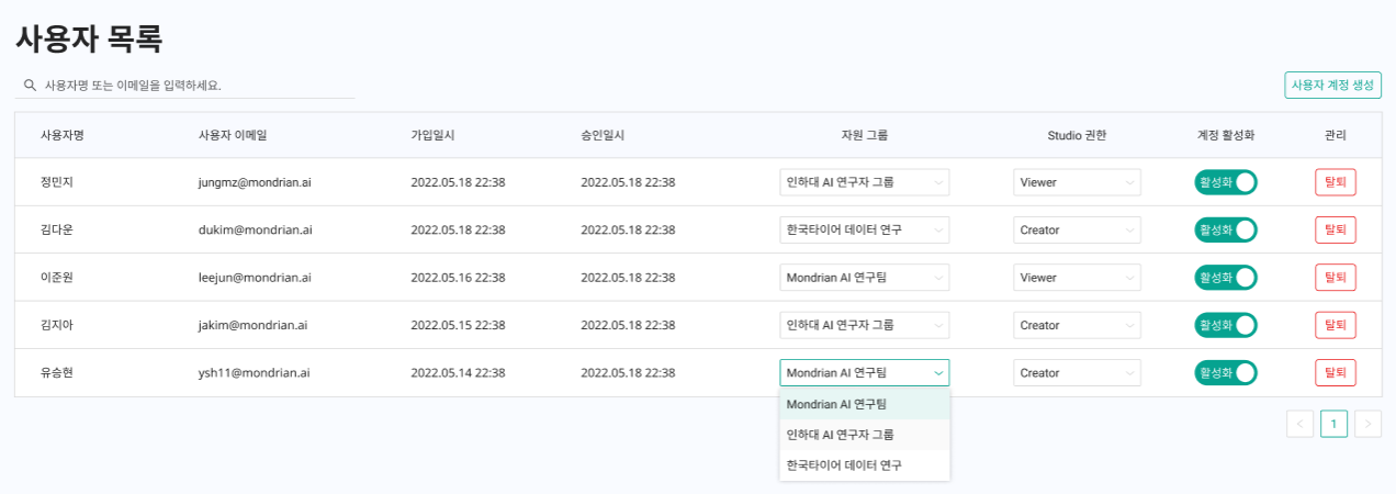 > 사용자의 정보 조회 및 사용자별 권한 관리가 가능하며, 계정을 추가 및 활성화하거나 상태를 변경할 수 있습니다.