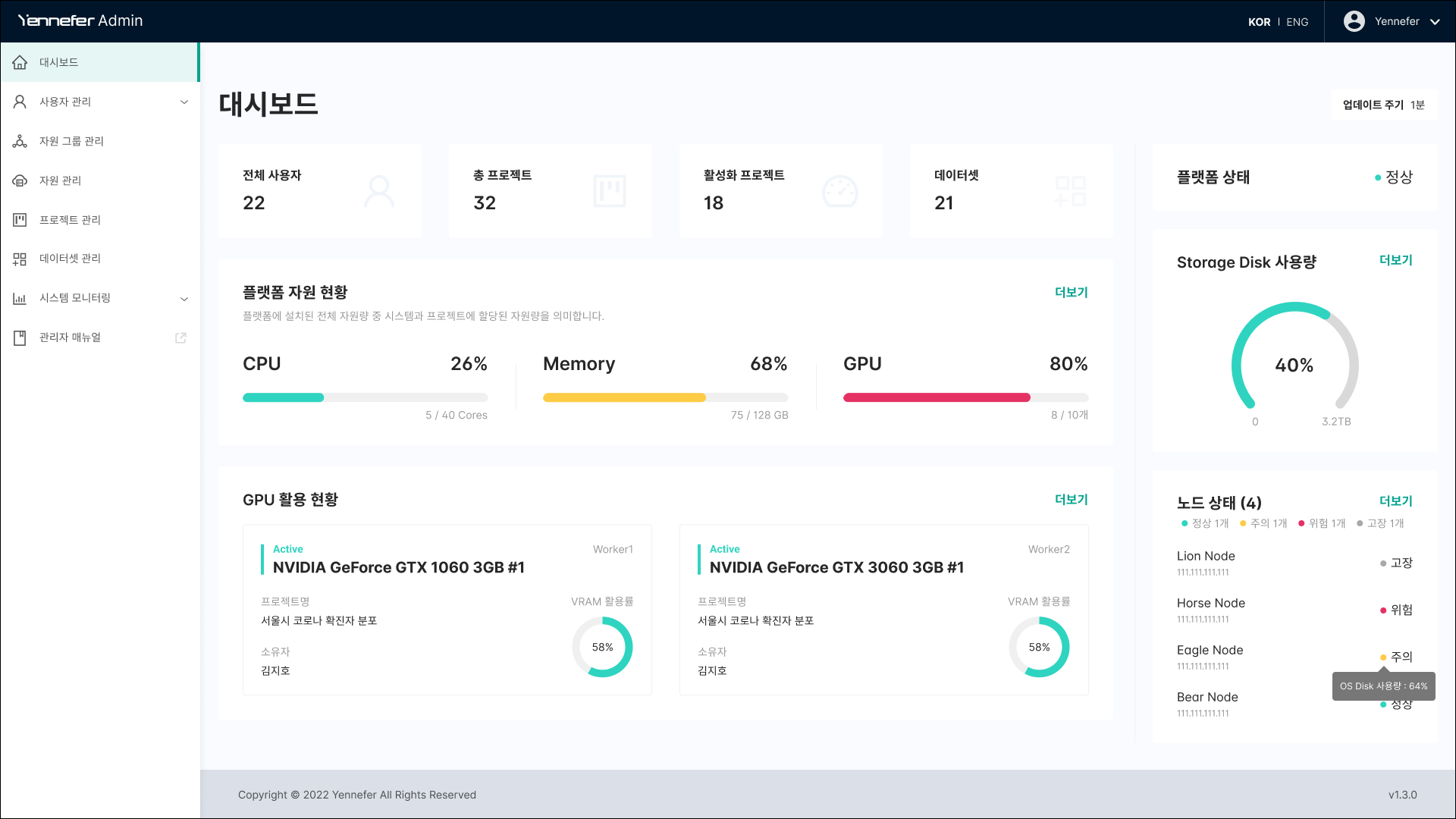 **Yennefer Admin**은 인공지능을 활용하기 위해 Elastic AI Infrastructure 기술을 활용하여 프라이빗 클러스터를 구성하고 사용량에 따라 탄력적이고 최적화된 자원 활용을 제공합니다. 조직 내 관리자가 손쉽게 사용자와 자원을 통합 모니터링/관리 할 수 있는 웹 GUI 관리 도구를 함께 제공합니다.