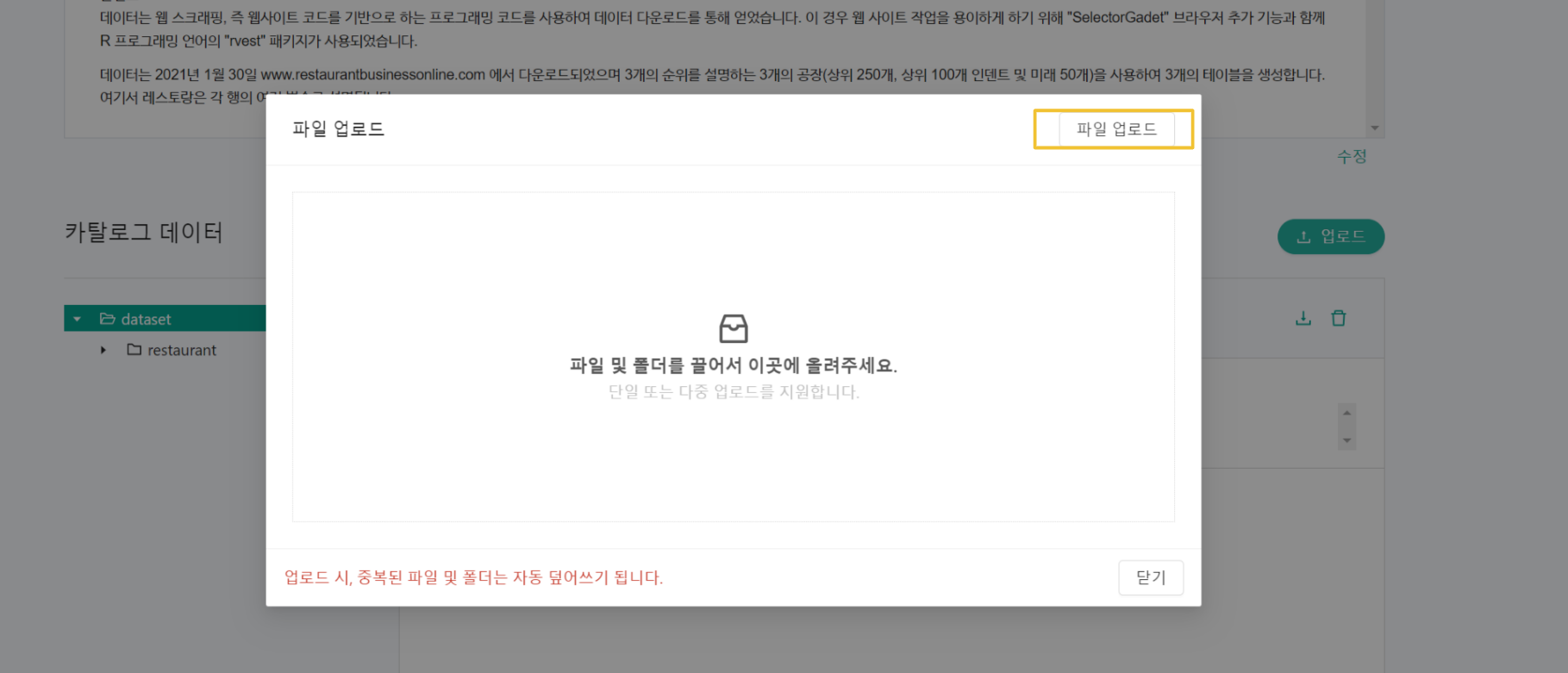 상세페이지 “데이터 및 리소스”탭의 하단에 카탈로그 데이터에서 업로드 버튼을 클릭하여 데이터를 추가합니다.