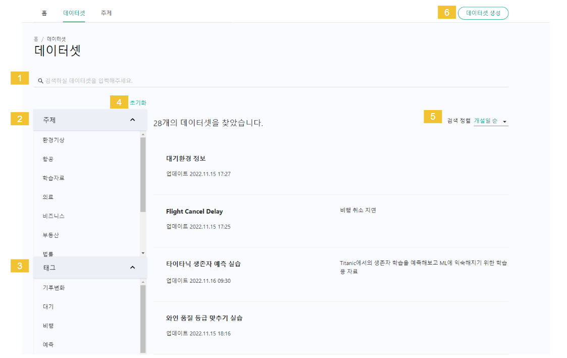 검색 정렬 : 개설일 또는 제목 순으로 데이터셋 목록을 정렬할 수 있습니다.