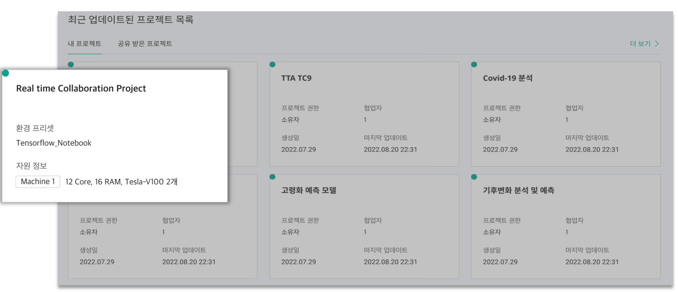 * 마우스를 프로젝트 카드 위에 올리면, **선택한 환경 프리셋과 프로젝트의 자원 정보**를 확인하실 수 있습니다.