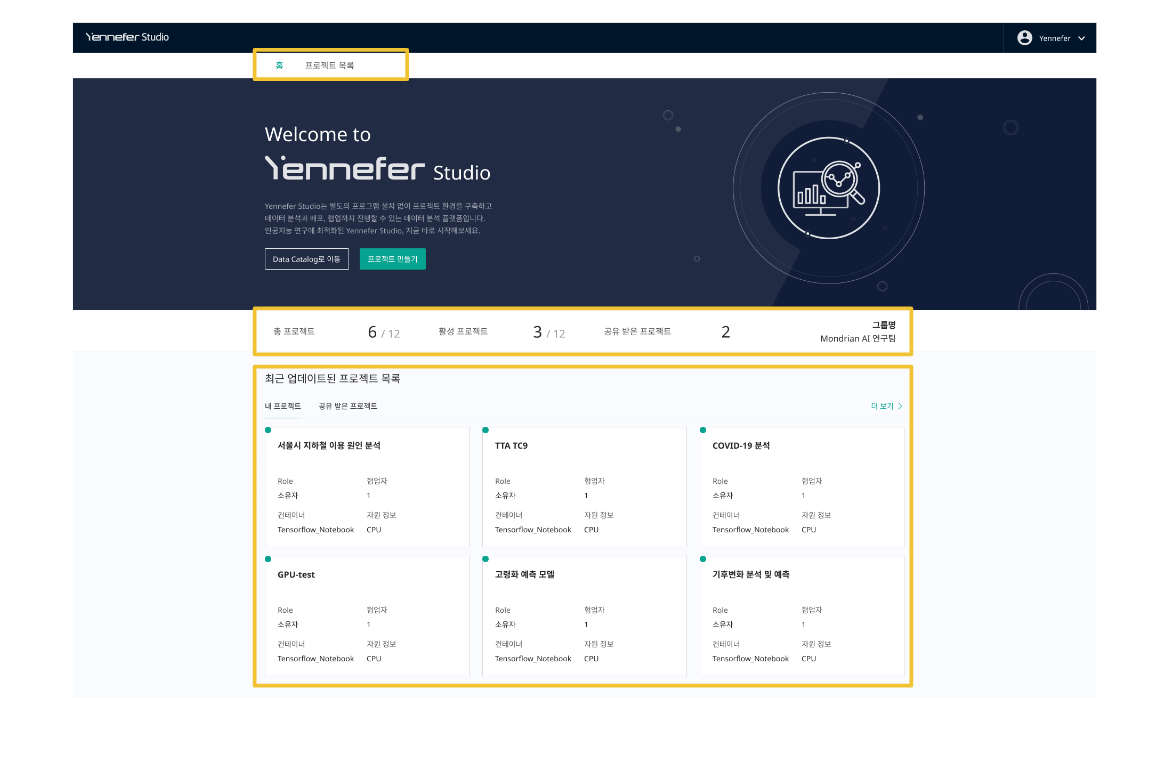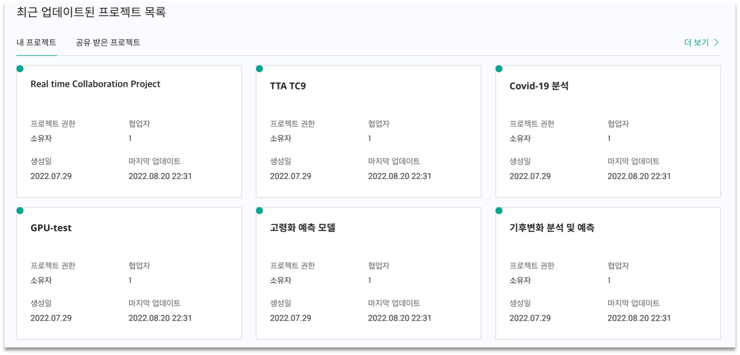 * **프로젝트 목록**: 내 프로젝트 및 공유 프로젝트 목록을 확인하실 수 있습니다.&#x20;