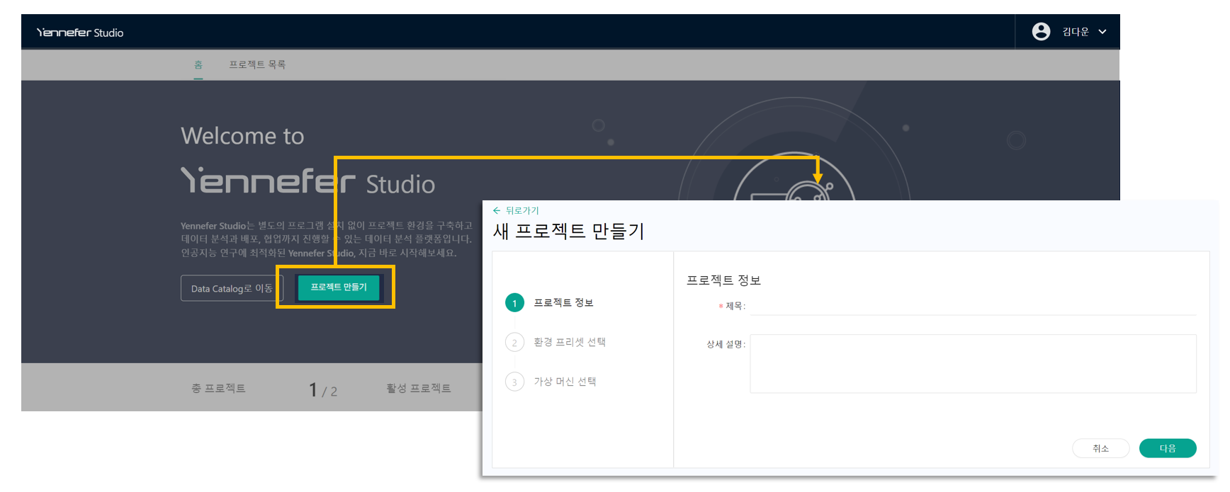 * **'프로젝트 만들기'** 버튼을 클릭하시면, 새 프로젝트 만들기 화면으로 이동합니다.    &#x20;