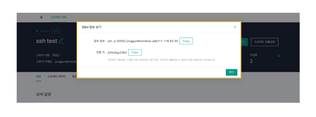 * 상세 페이지 **"SSH 정보 보기"** 버튼을 클릭하면, 모달이 출력됩니다.&#x20;