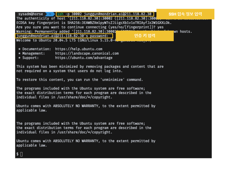 * PC에서 명령 프롬프트 창을 엽니다. ssh를 입력하고, 복사한 **"접속 정보"**&#xB97C; 붙여넣기합니다.