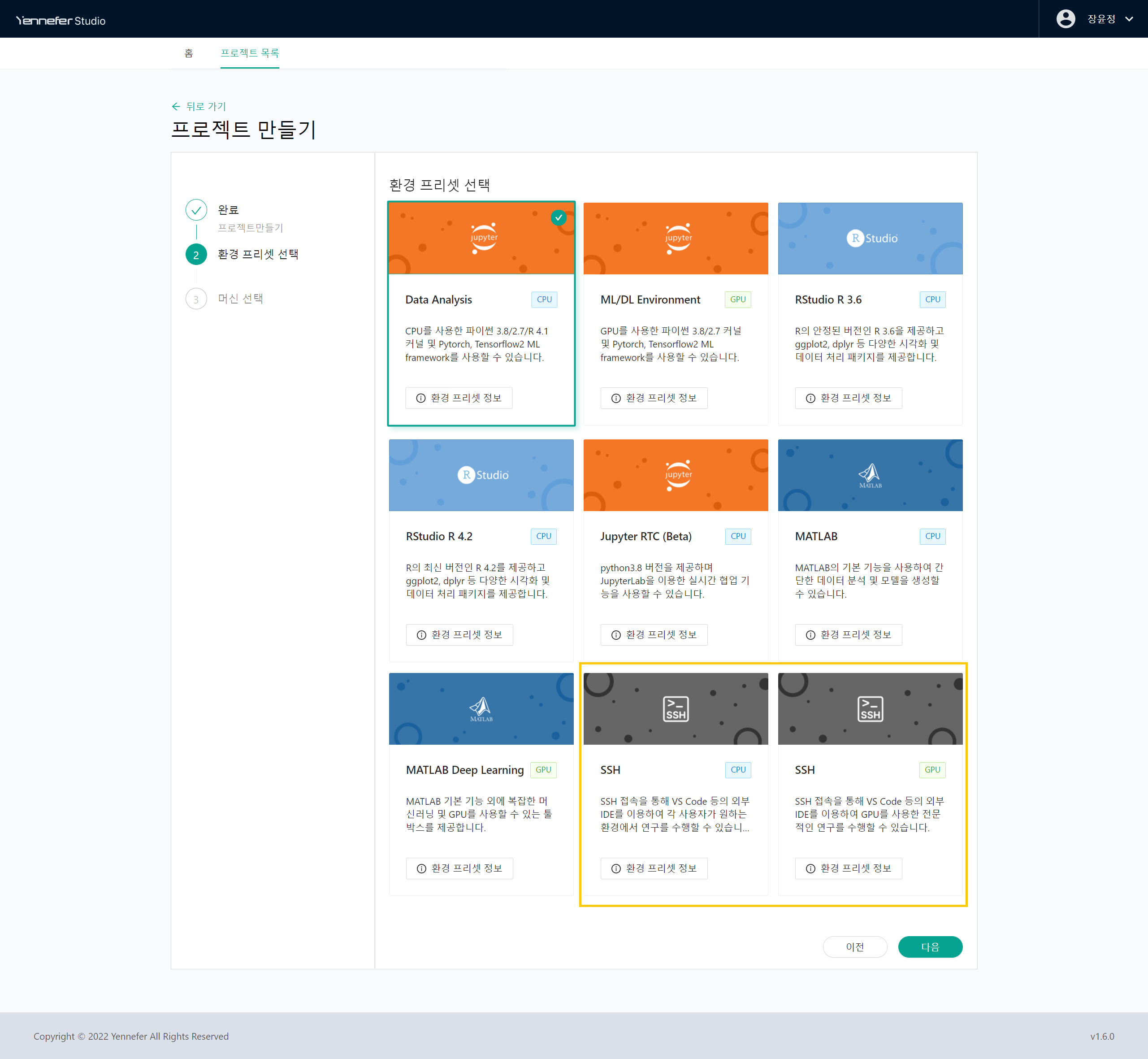 * 환경 프리셋 선택 단계에서 SSH를 선택합니다.