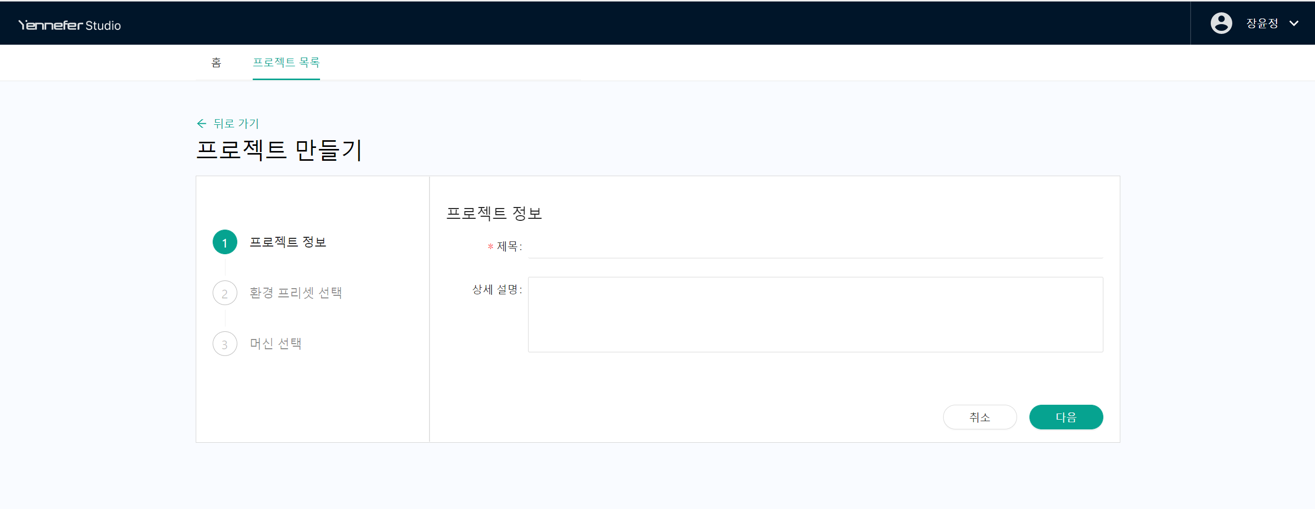 * 프로젝트 페이지 페이지에서 제목과 프로젝트에 대한 설명을 적은 뒤 다음 버튼을 클릭하세요.