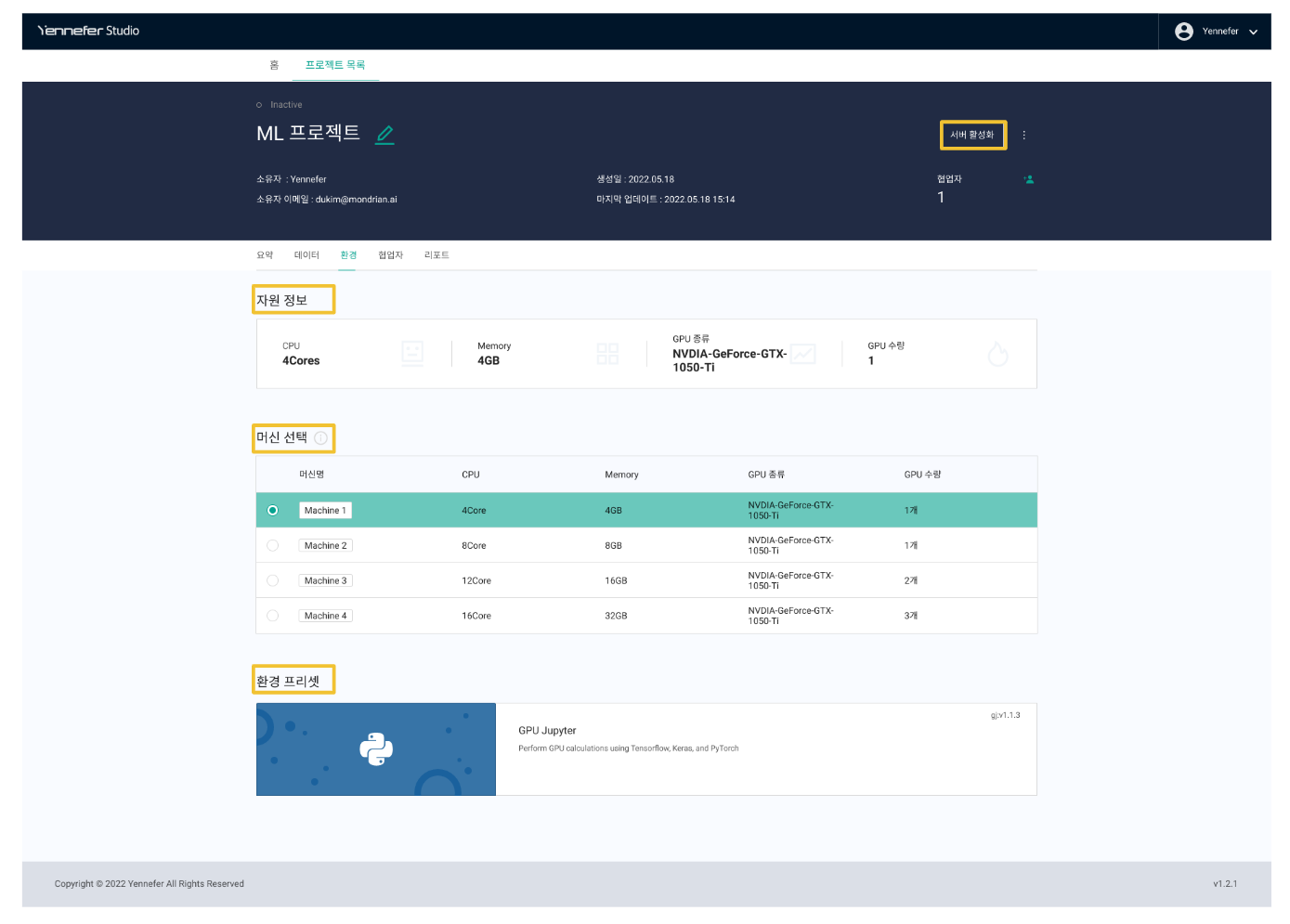 * **머신(자원) 선택 :** 사용자가 사용할 수 있는 머신(자원) 정보를 확인할 수 있습니다. 머신 변경이 필요한 경우, **서버 비활성화 상태**일 때만 변경이 가능합니다.&#x20;