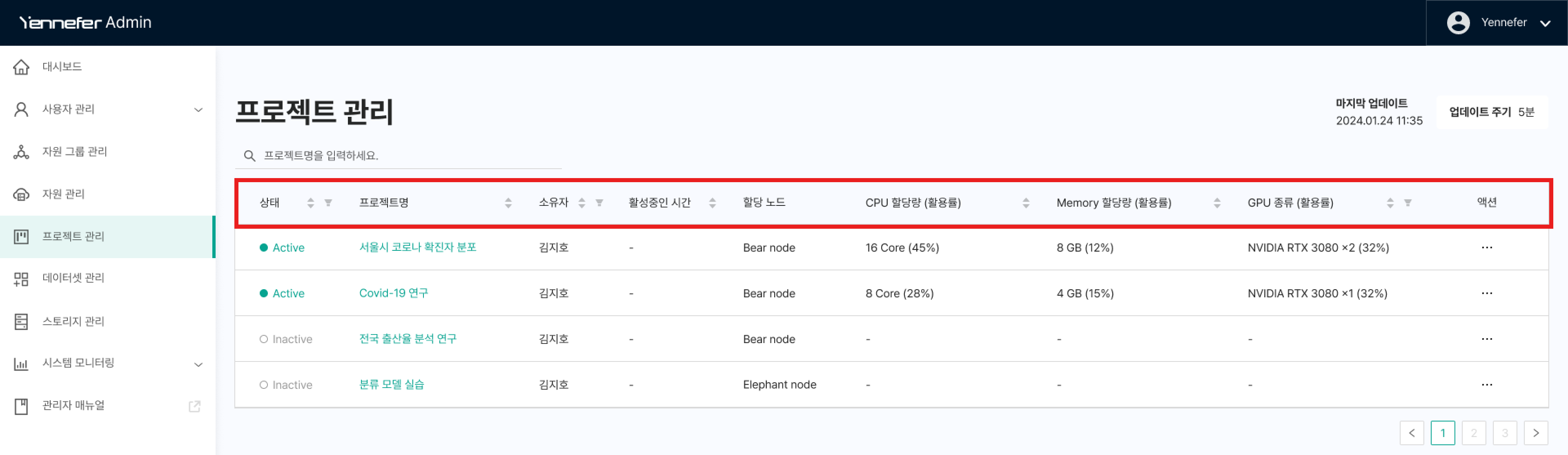 > 프로젝트 관리에서는 시스템에 생성된 전체 프로젝트 현황을 확인하고 제어할 수 있습니다.