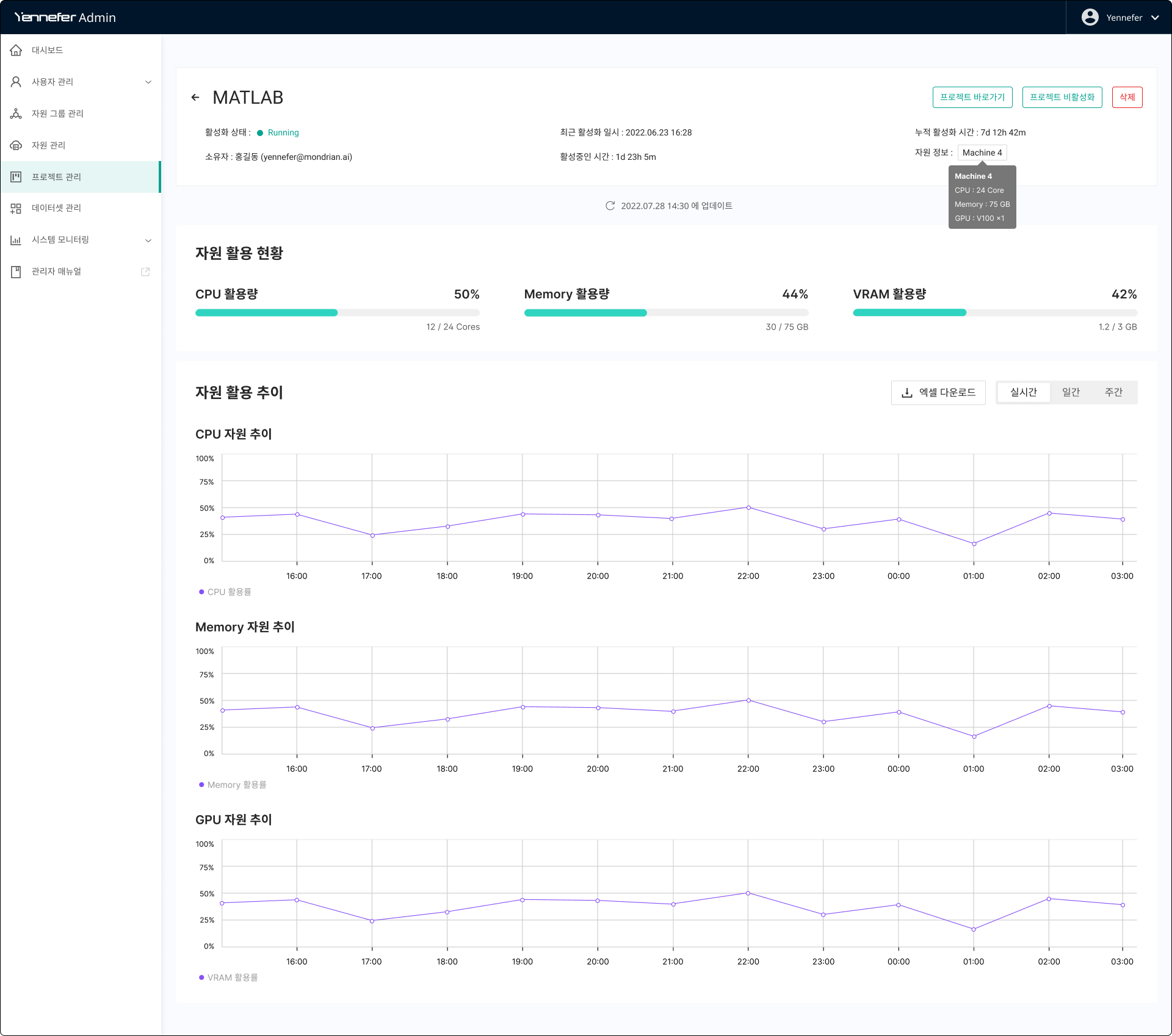* **GPU 종류 (활용률) :** 프로젝트에 할당된 GPU의 종류와 개수 그리고 현재 VRAM 활용률을 의미합니다.