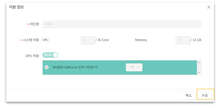 * 시스템 자원에서 해당 머신이 사용 가능한 **CPU, Memory**값을 입력합니다. **( 1 이상의 정수만 입력 가능)**