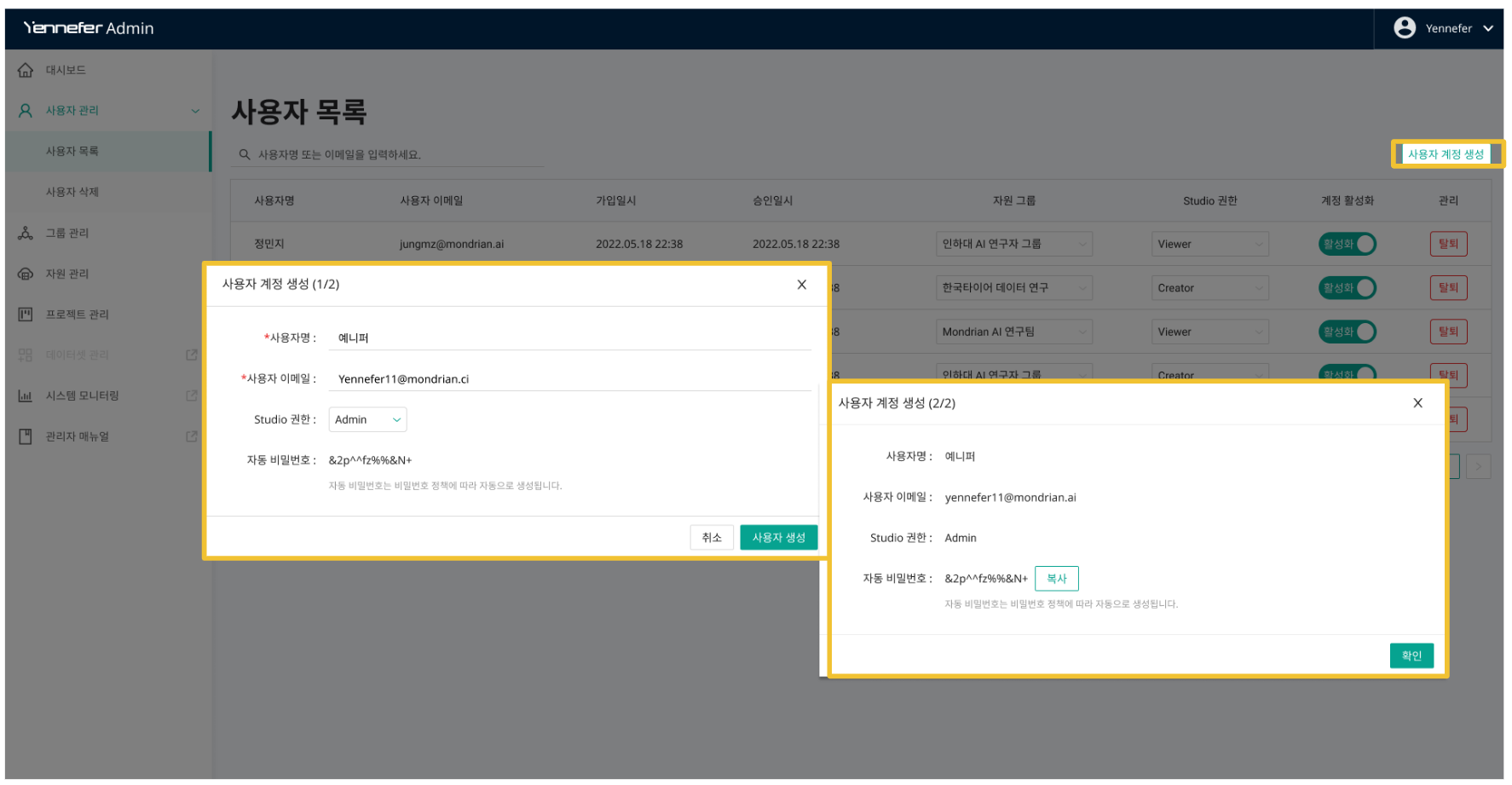 이때 완료 모달이 뜨고지면 자동 비밀번호가 부여됩니다. 모달창이 꺼지면 확인이 불가하니 반드시 복사하여 해당 사용자에게 전달하시기 바랍니다.