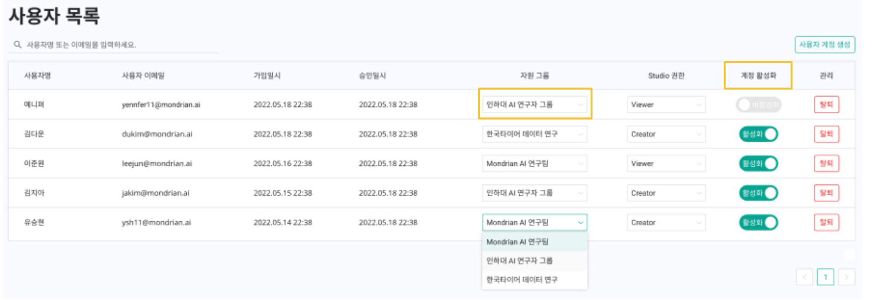 사용자 관리는 사용자 목록과 사용자 삭제로 구성되어있습니다. 사용자의 정보 조회 및 사용자별 권한 관리가 가능하며, 계정을 추가 및 활성화하거나 상태를 변경할 수 있습니다.